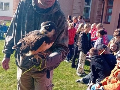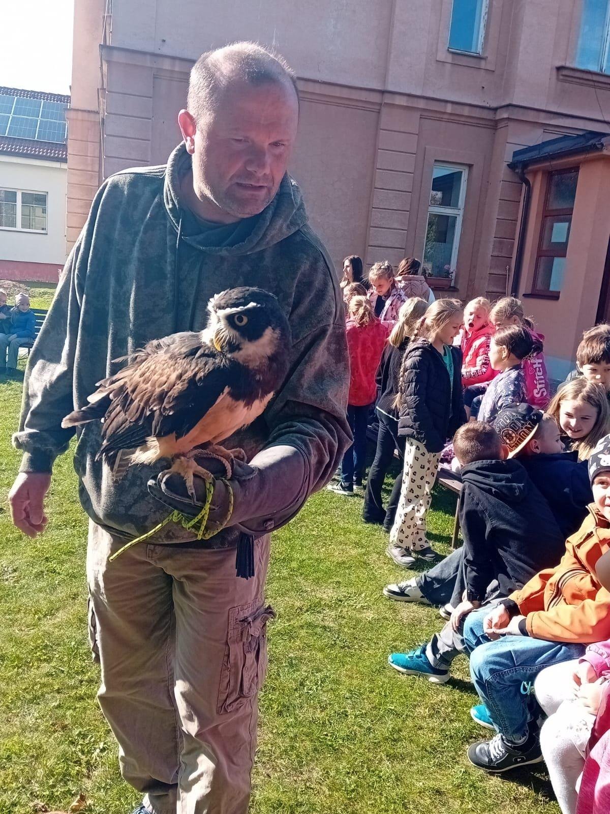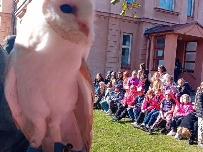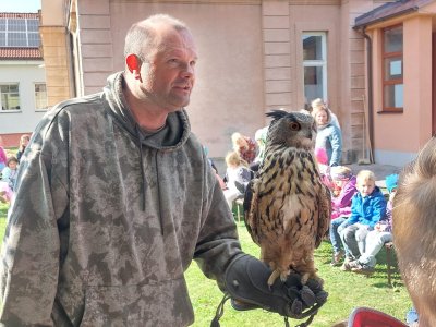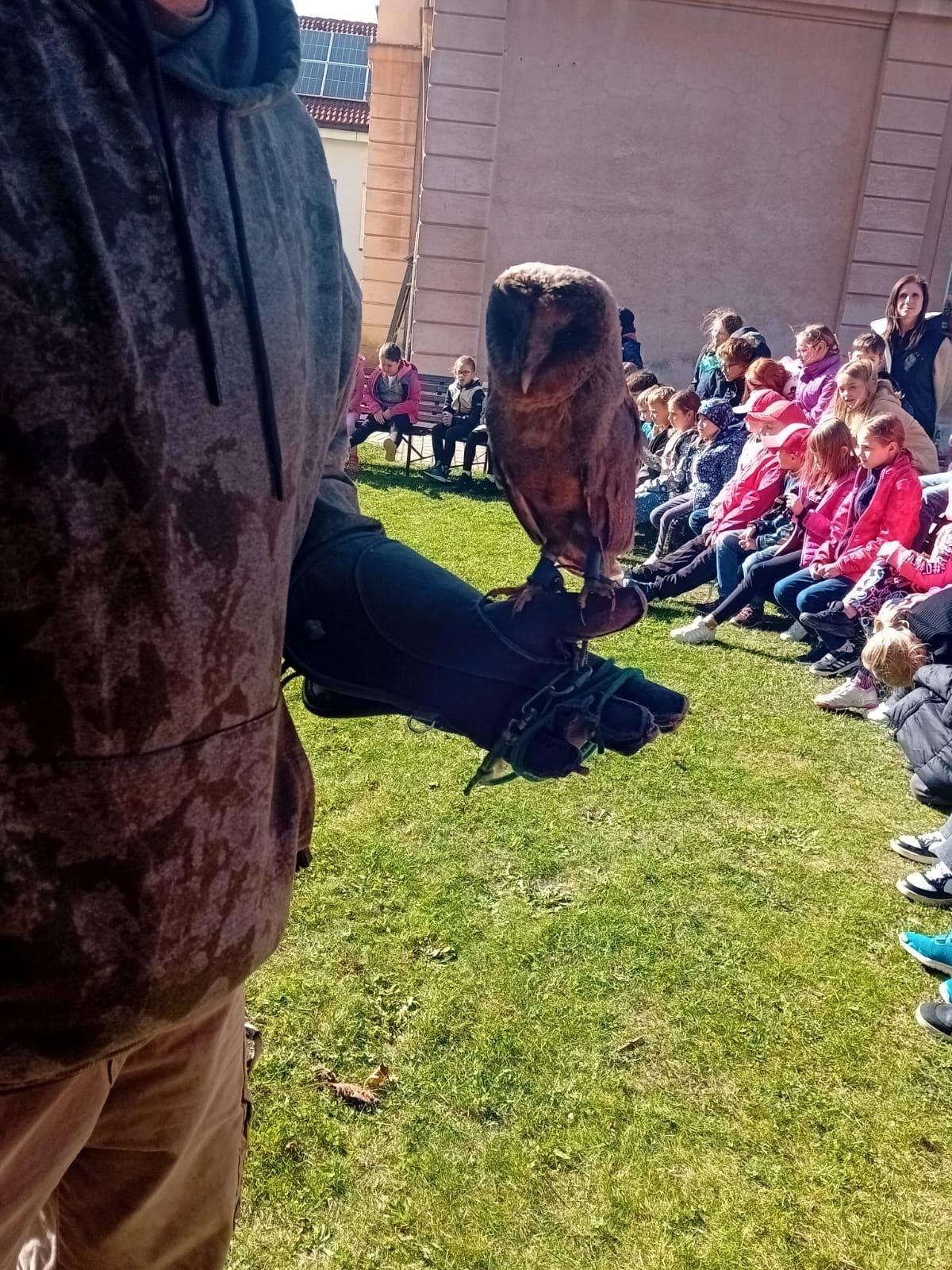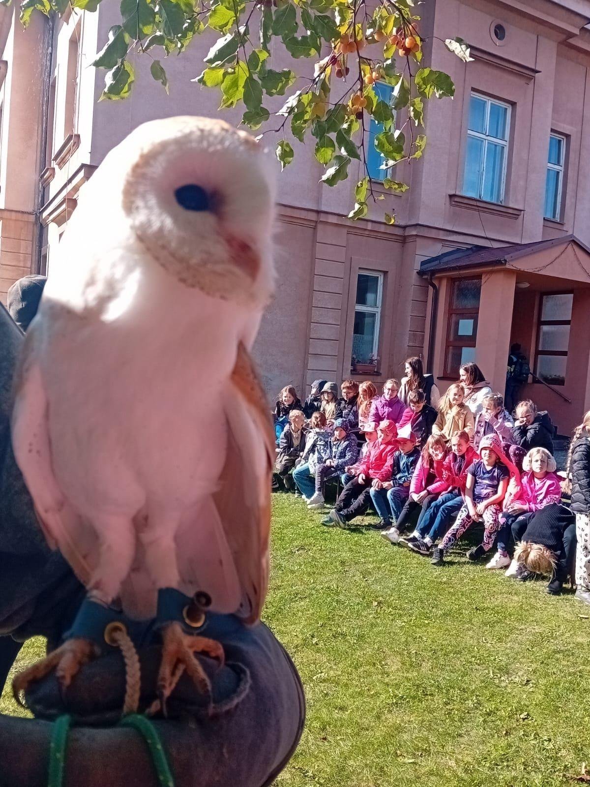 Ve čtvrtek odpoledne se zahrada školní družiny proměnila v místo plné kouzelné atmosféry a fascinujících příběhů ze světa nočních ptáků. Měli jsme jedinečnou příležitost setkat se s nadšenými chovateli dravců a sov, Radkem a Petrou Podolskými ze vzdělávacího centra „Království sov".