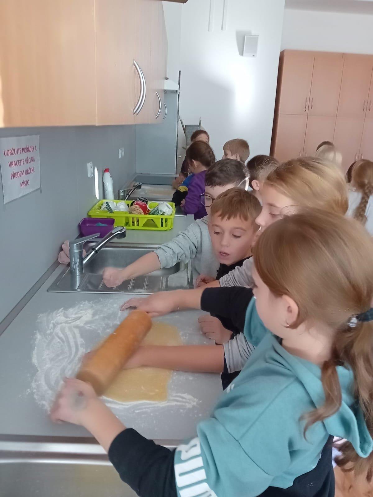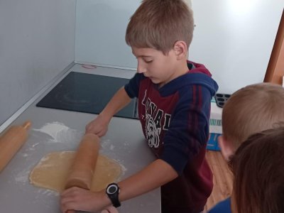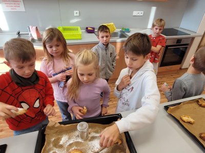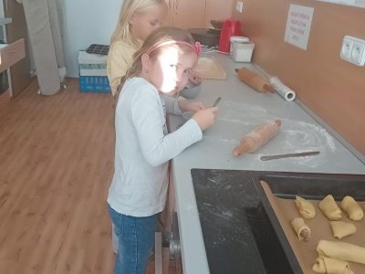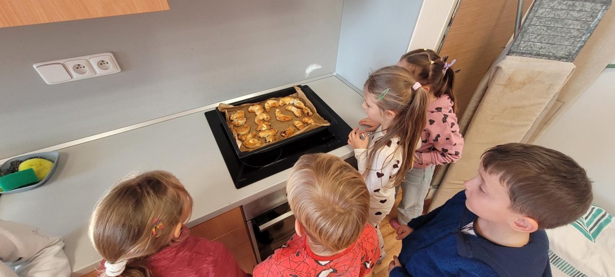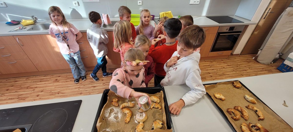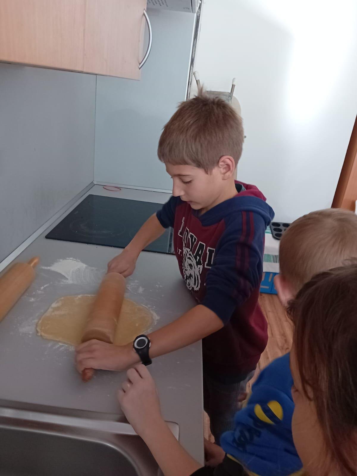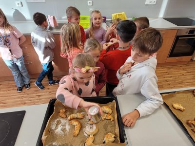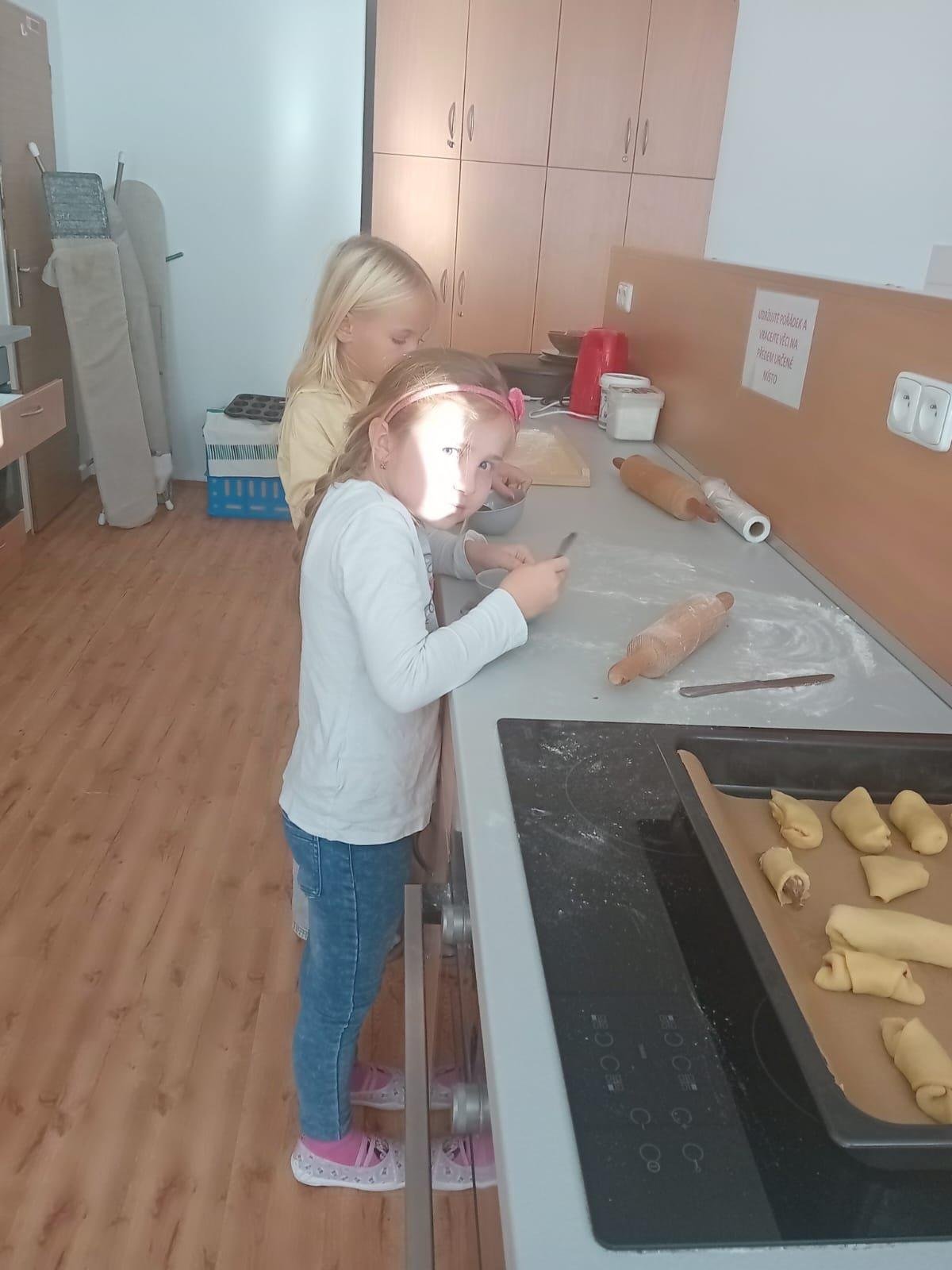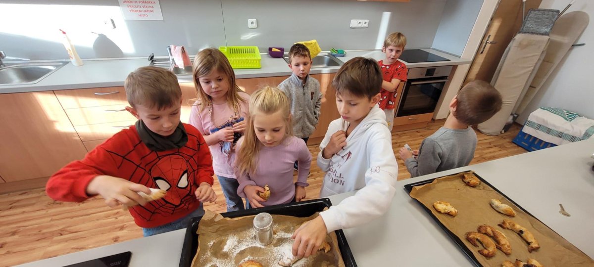 Děti si tentokrát vyzkoušely svatomartinské pečení, které probíhalo s velkým nadšením. Malí pekaři si vlastnoručně připravili svatomartinské rohlíčky plněné voňavým mákem a jemným tvarohem. Vznikaly tak malé, krásně zlatavé dobroty, na kterých si všichni s radostí pochutnali.