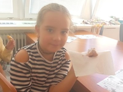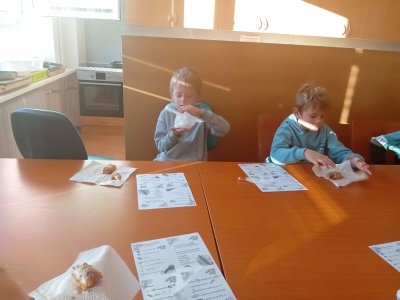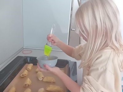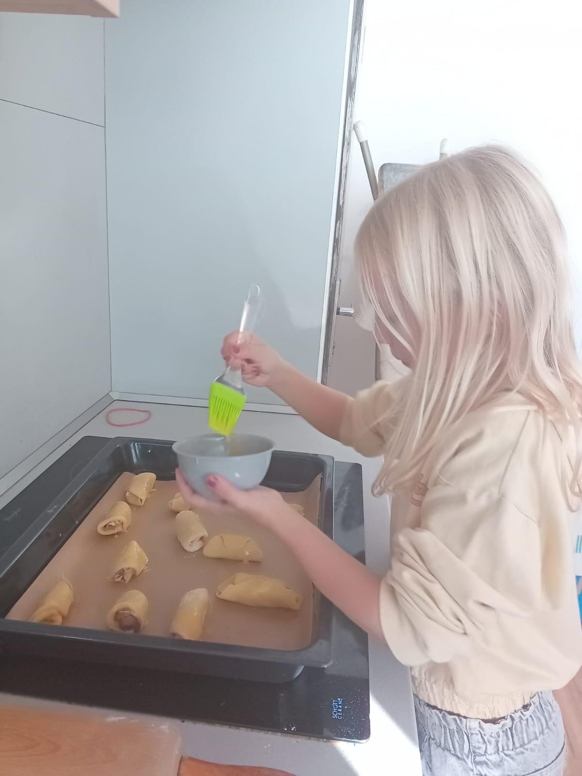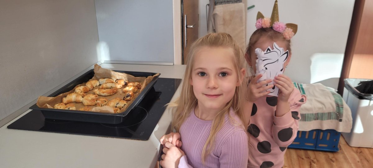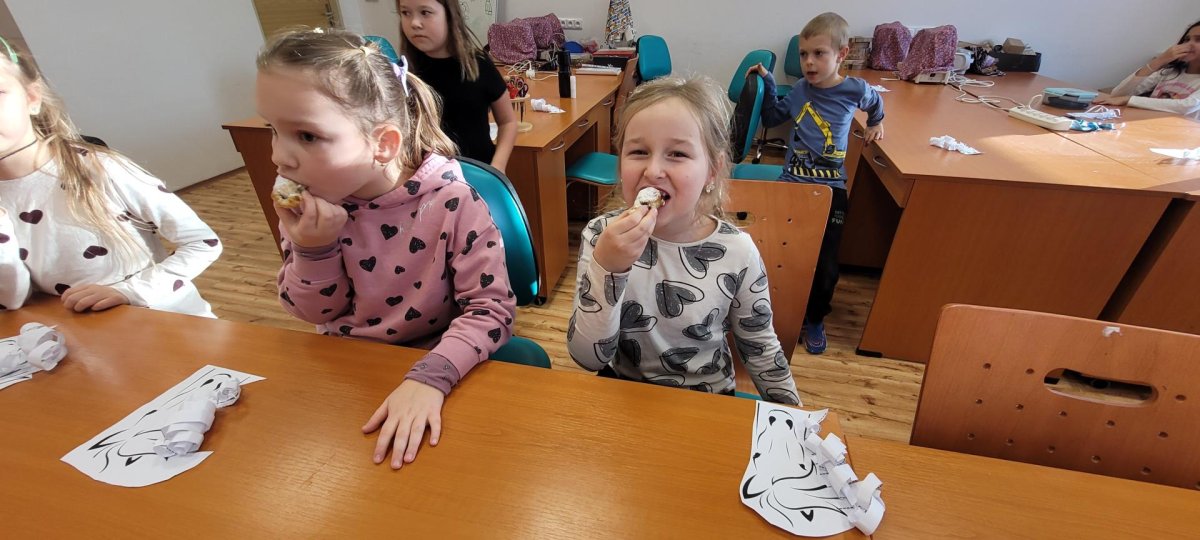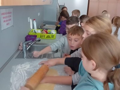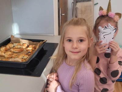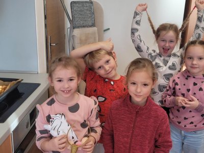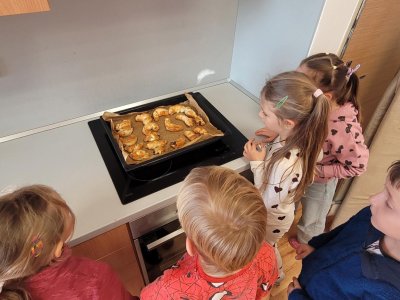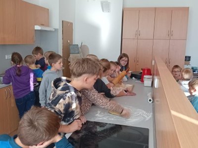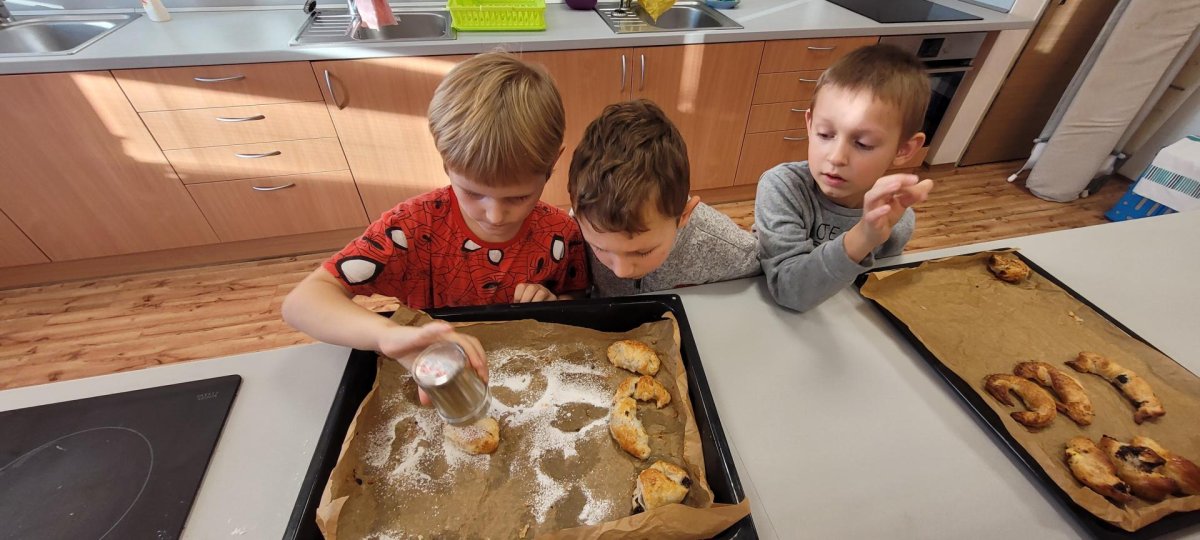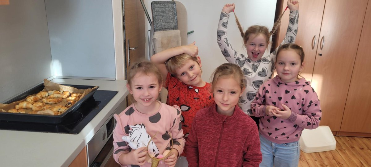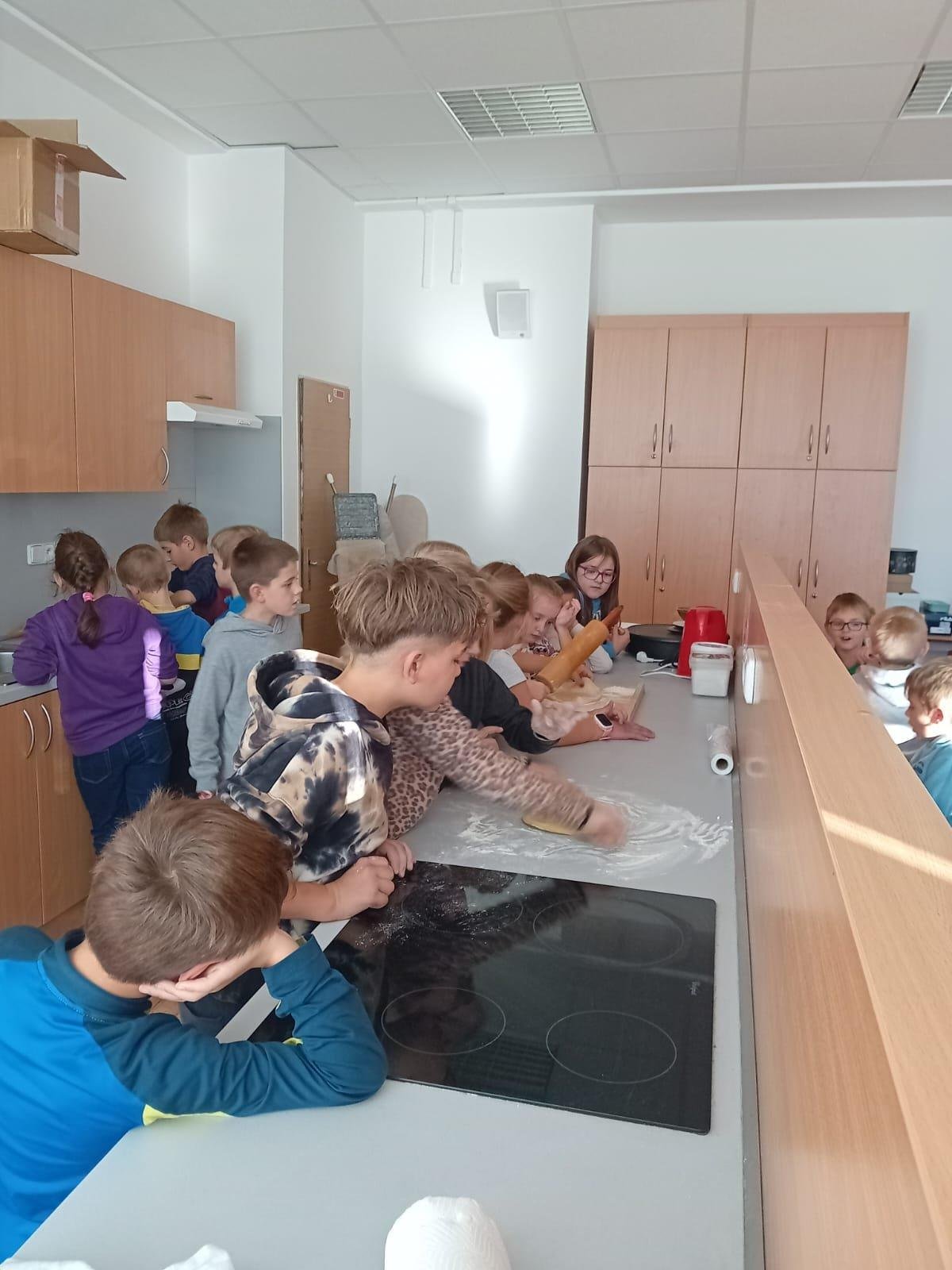 Děti si tentokrát vyzkoušely svatomartinské pečení, které probíhalo s velkým nadšením. Malí pekaři si vlastnoručně připravili svatomartinské rohlíčky plněné voňavým mákem a jemným tvarohem. Vznikaly tak malé, krásně zlatavé dobroty, na kterých si všichni s radostí pochutnali.