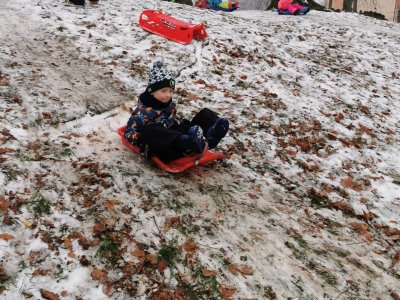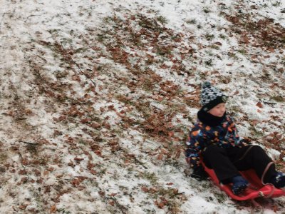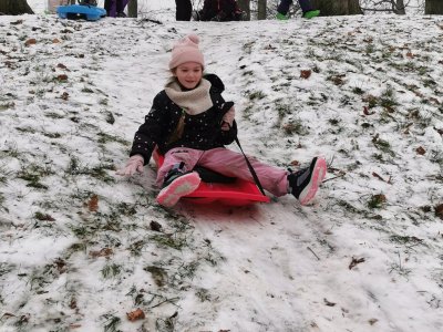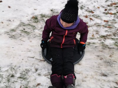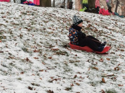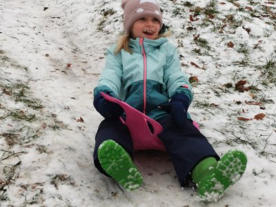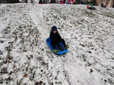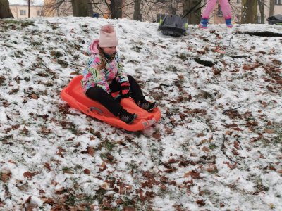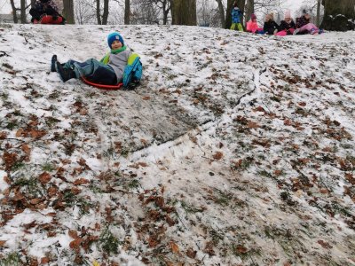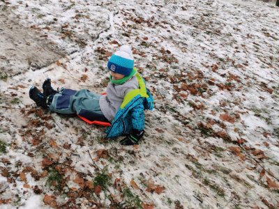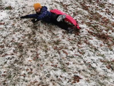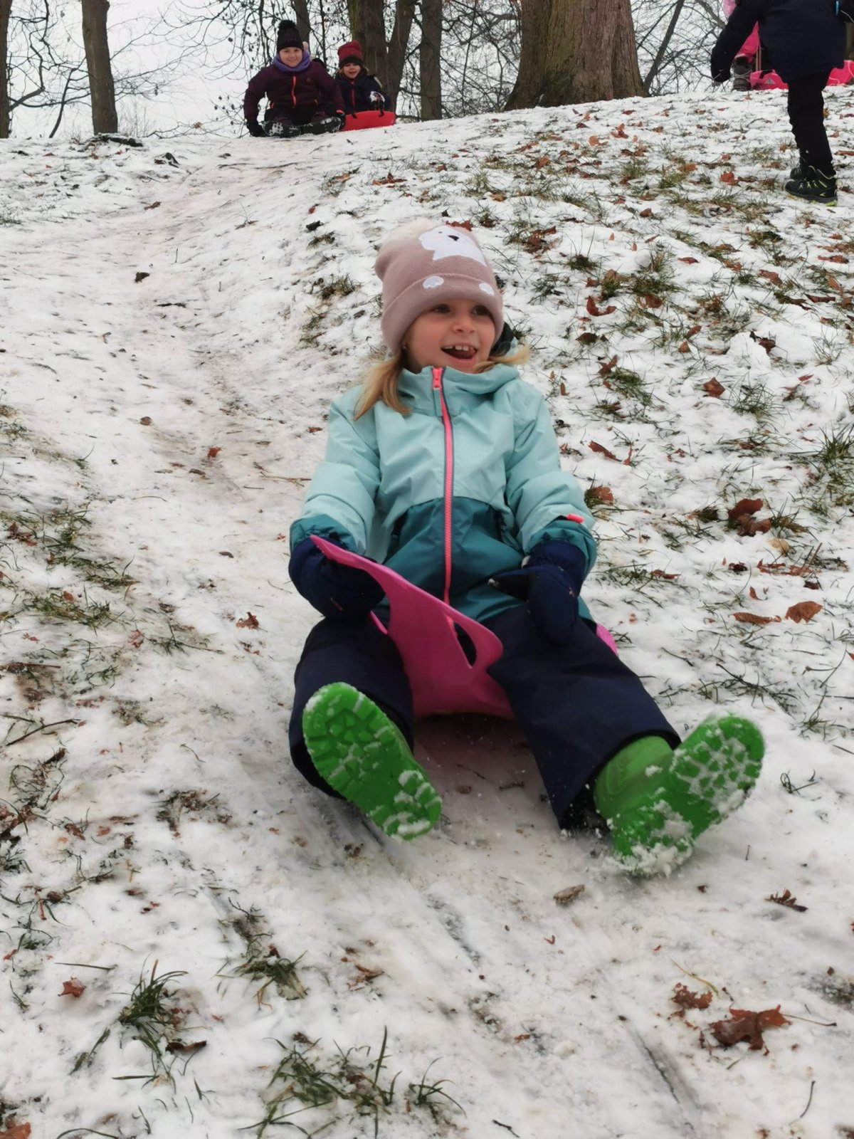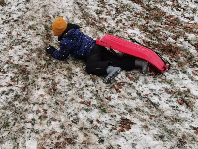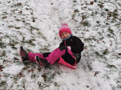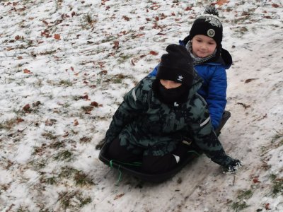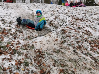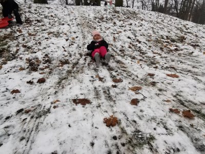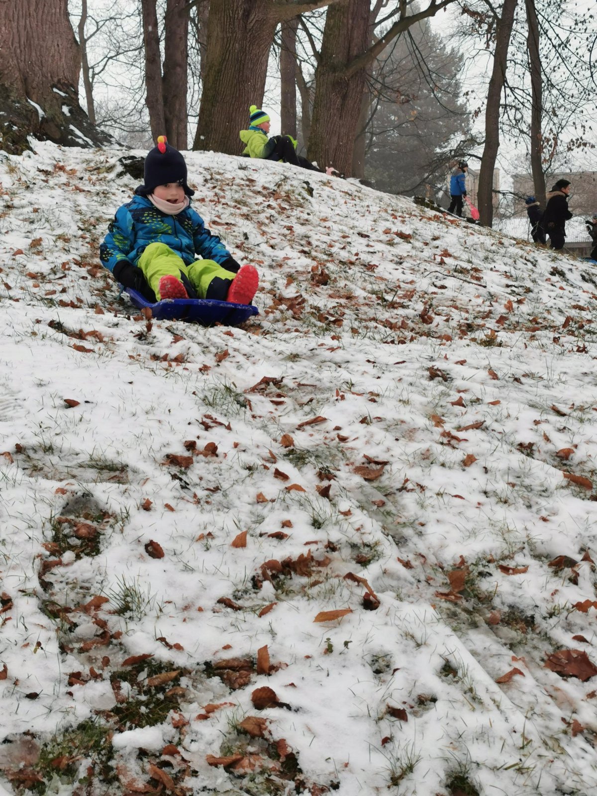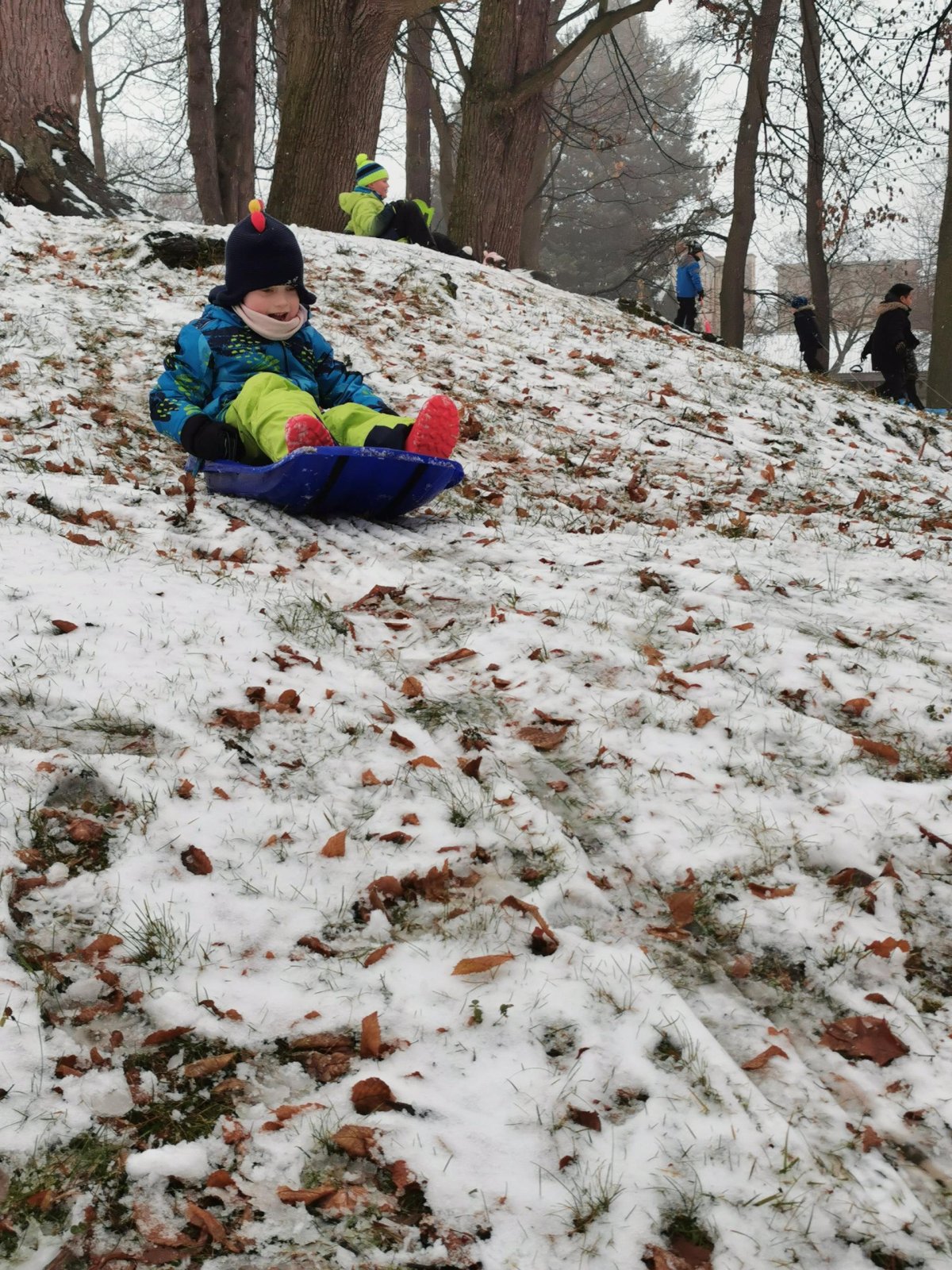 Po dvaceti minutách jsme opravdu dorazili na Kopečky. A i když sněhu bylo jen tak akorát, aby se to dalo nazvat zimou, dětská radost nezná fyzikální zákony. Jezdilo se, padalo, smálo se, boby létaly všemi směry a bylo to prostě prima.