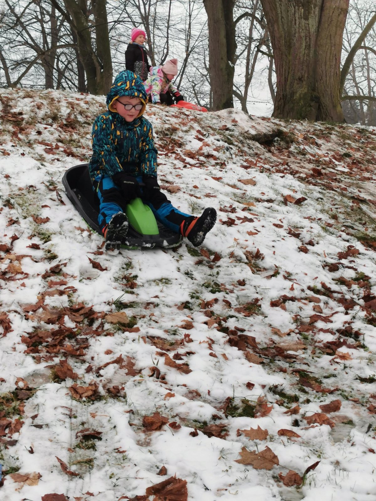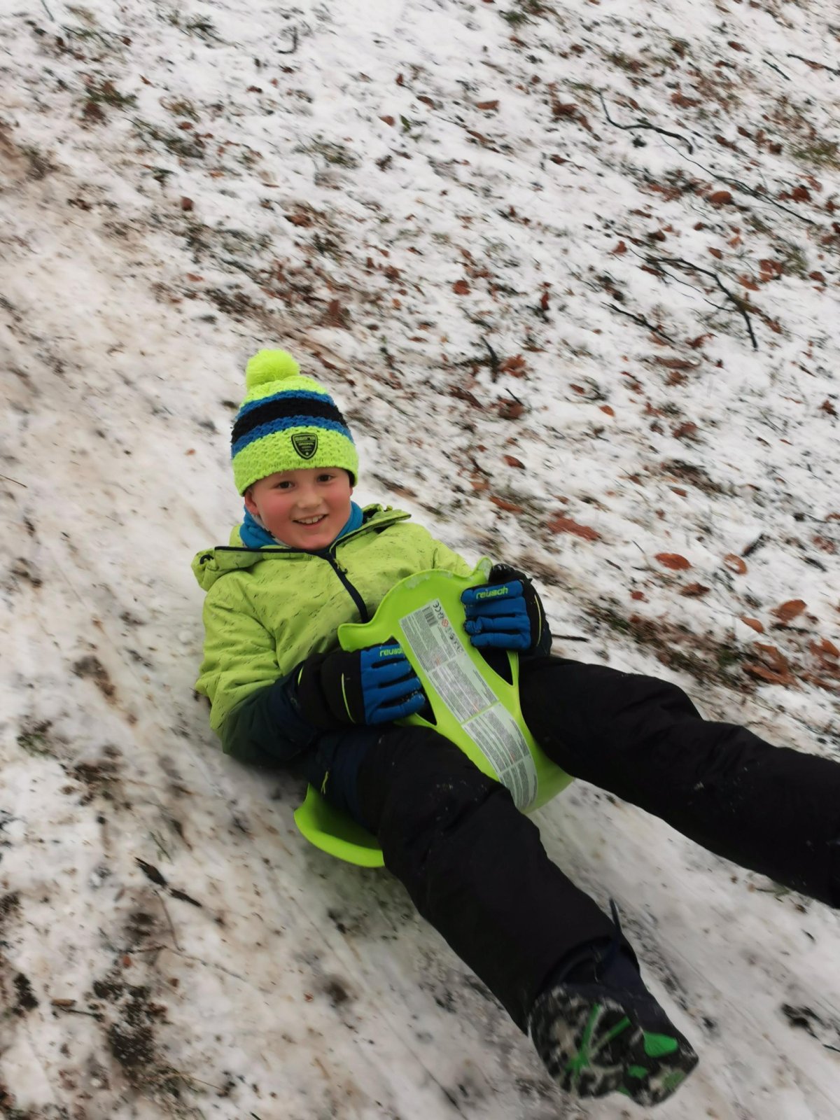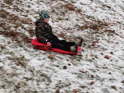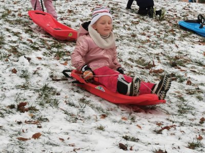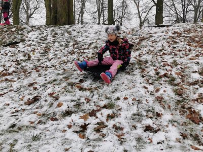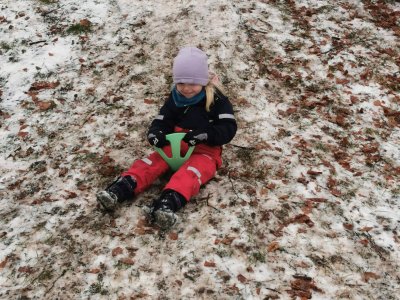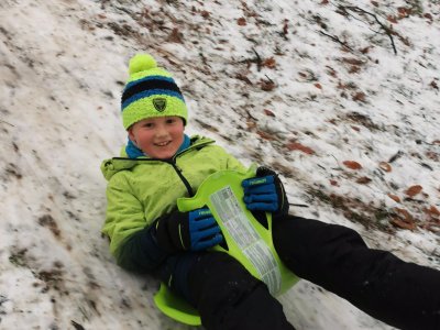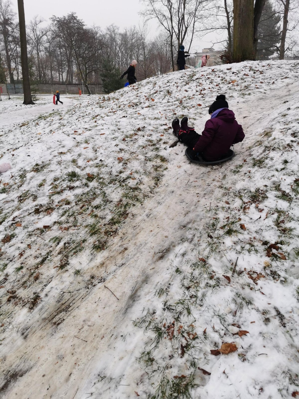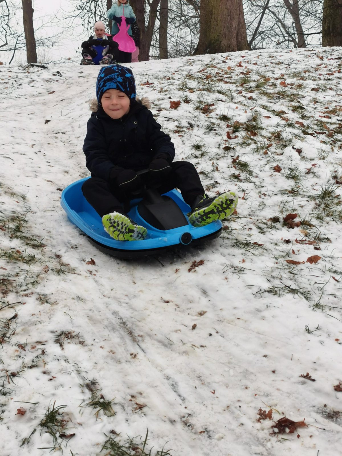 Po dvaceti minutách jsme opravdu dorazili na Kopečky. A i když sněhu bylo jen tak akorát, aby se to dalo nazvat zimou, dětská radost nezná fyzikální zákony. Jezdilo se, padalo, smálo se, boby létaly všemi směry a bylo to prostě prima.