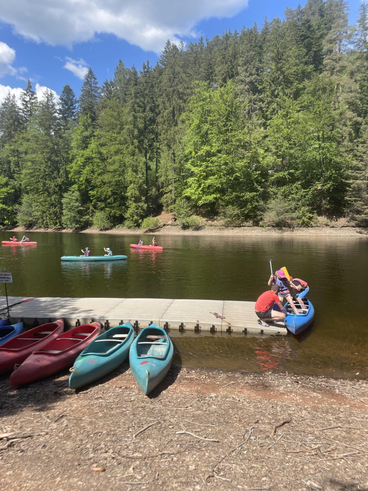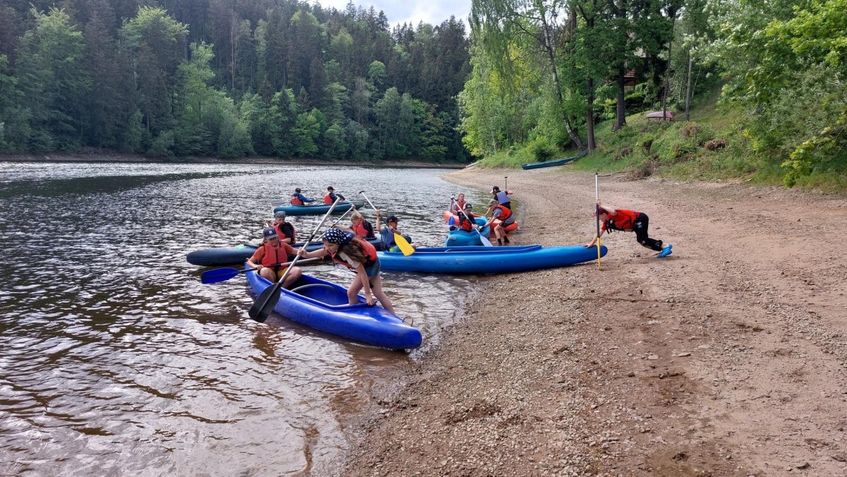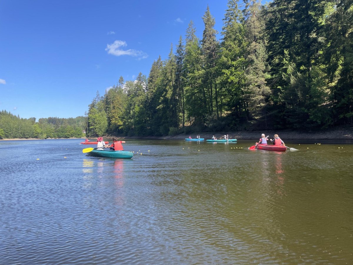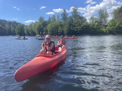 Druhý den jsme vyrazili ke hrázi. Kromě pozorování zmiňované hráze jsme zažili první cvaknutí, viděli jsme sportovní výkon pana učitele při zachraňování a všichni pochopili, že tu vestu na sobě nenosí jen tak pro nic za nic. Voda byla sice studená, ale odpolední slunce zlákalo děti i ke krátkému koupání.