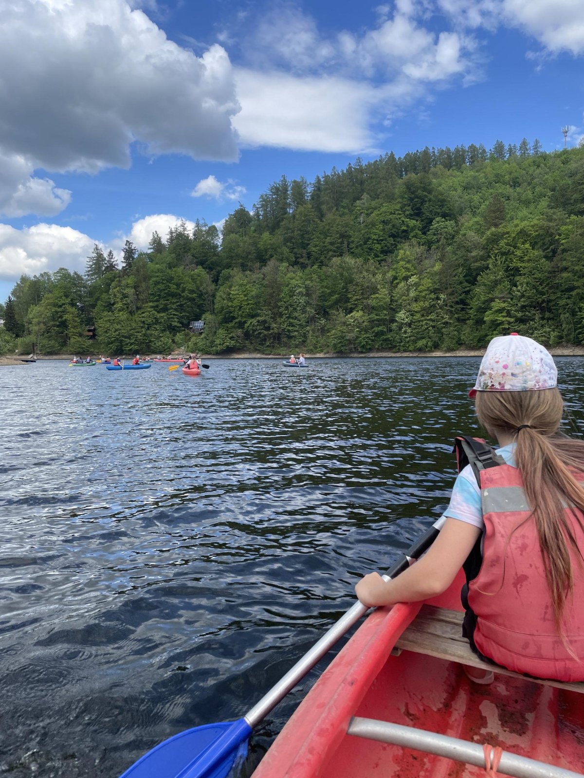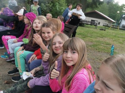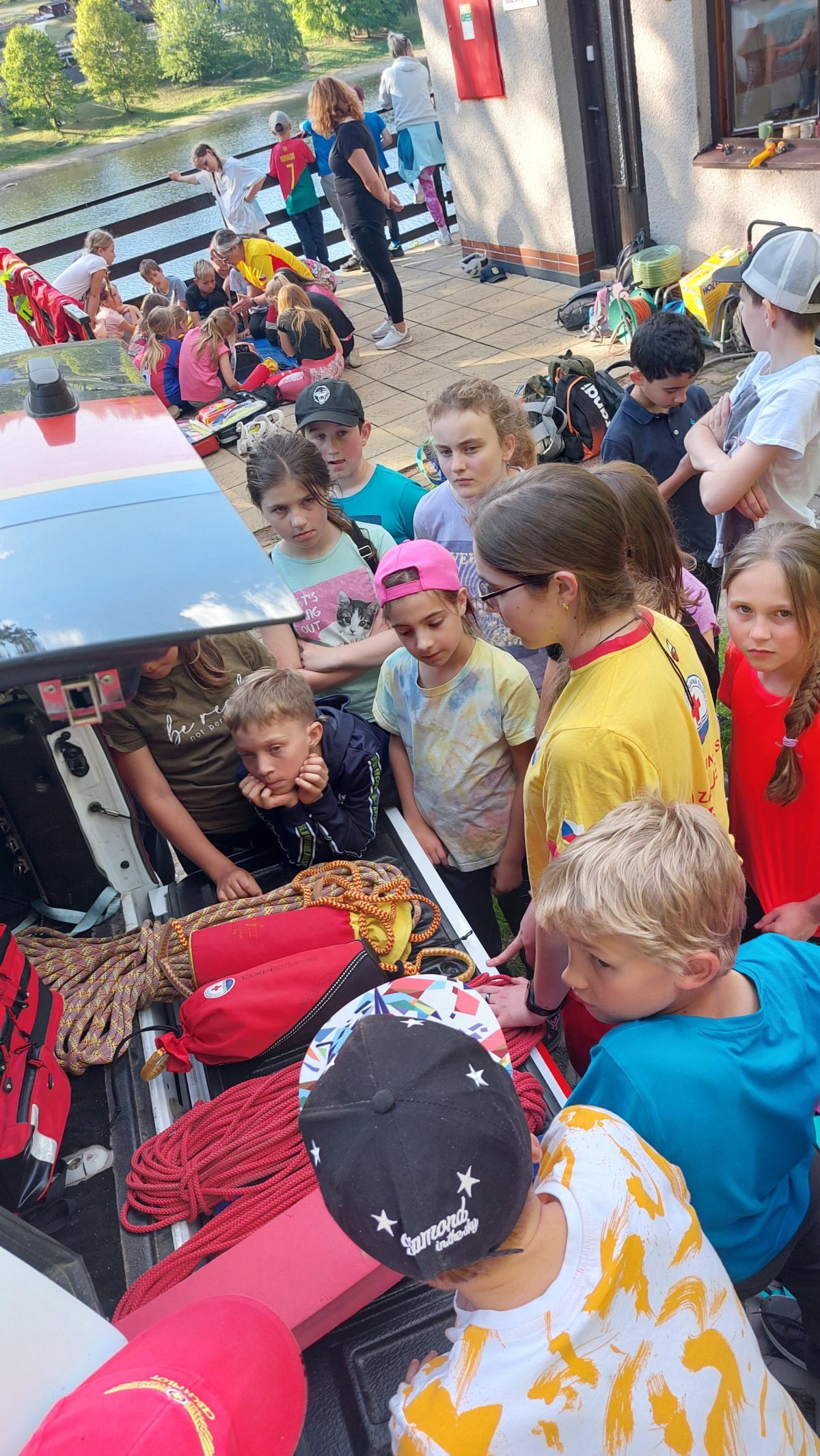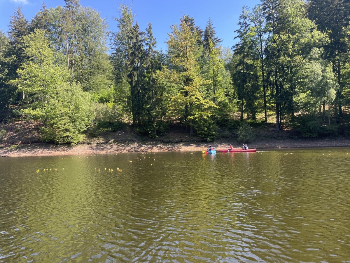 Druhý den jsme vyrazili ke hrázi. Kromě pozorování zmiňované hráze jsme zažili první cvaknutí, viděli jsme sportovní výkon pana učitele při zachraňování a všichni pochopili, že tu vestu na sobě nenosí jen tak pro nic za nic. Voda byla sice studená, ale odpolední slunce zlákalo děti i ke krátkému koupání.