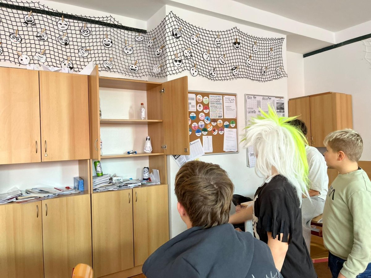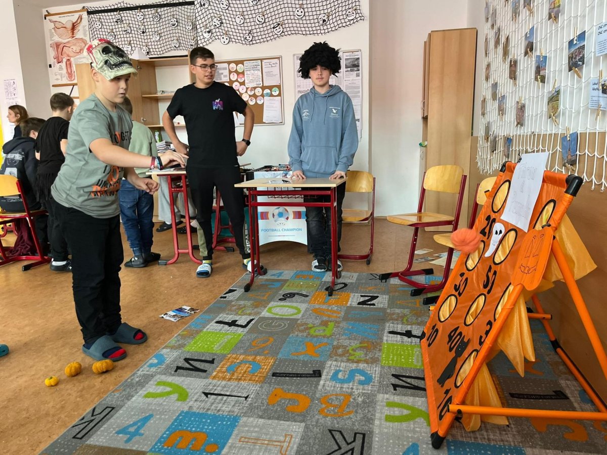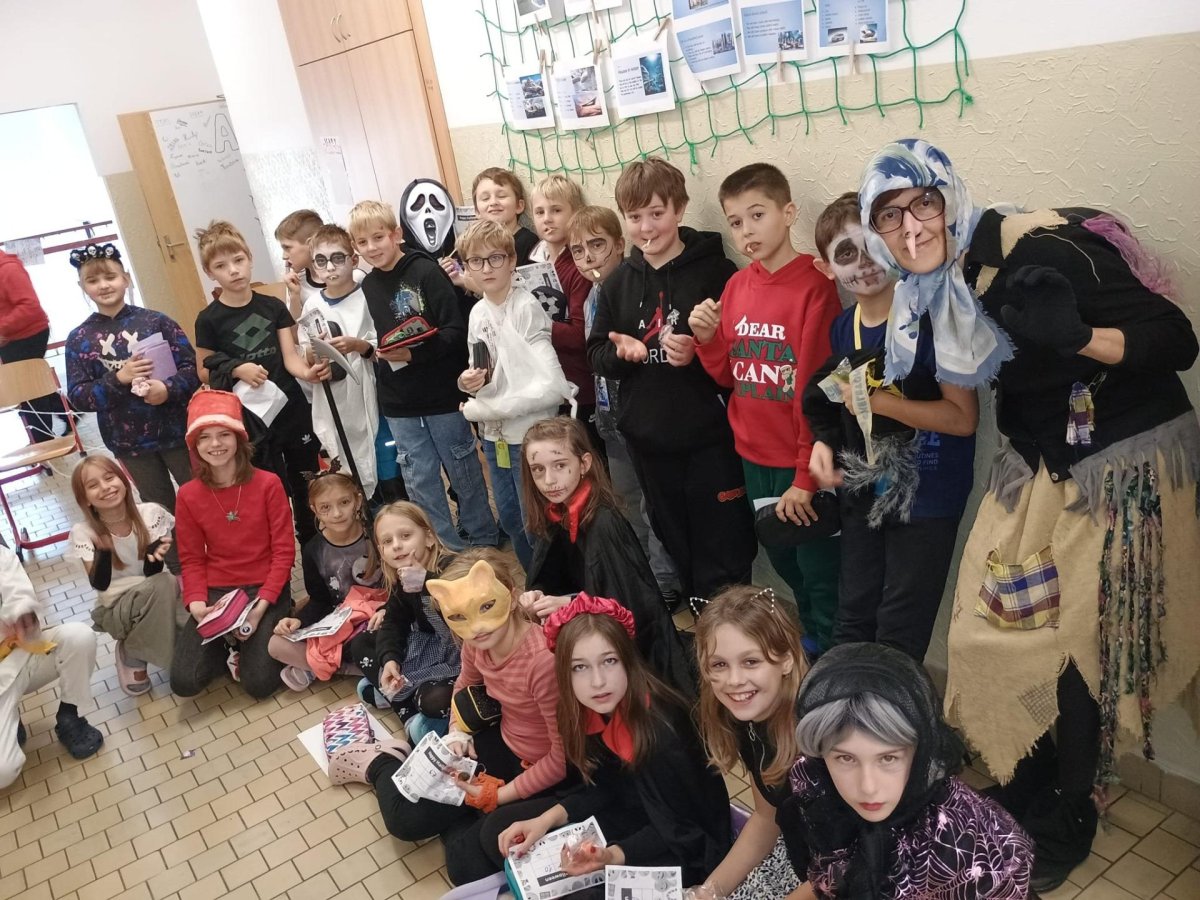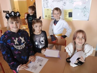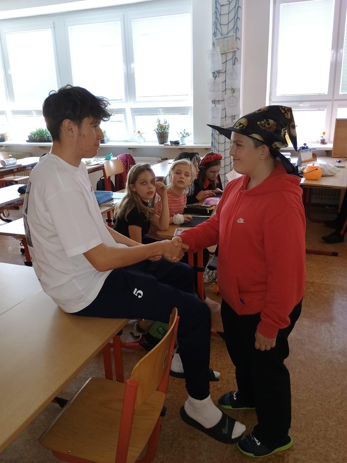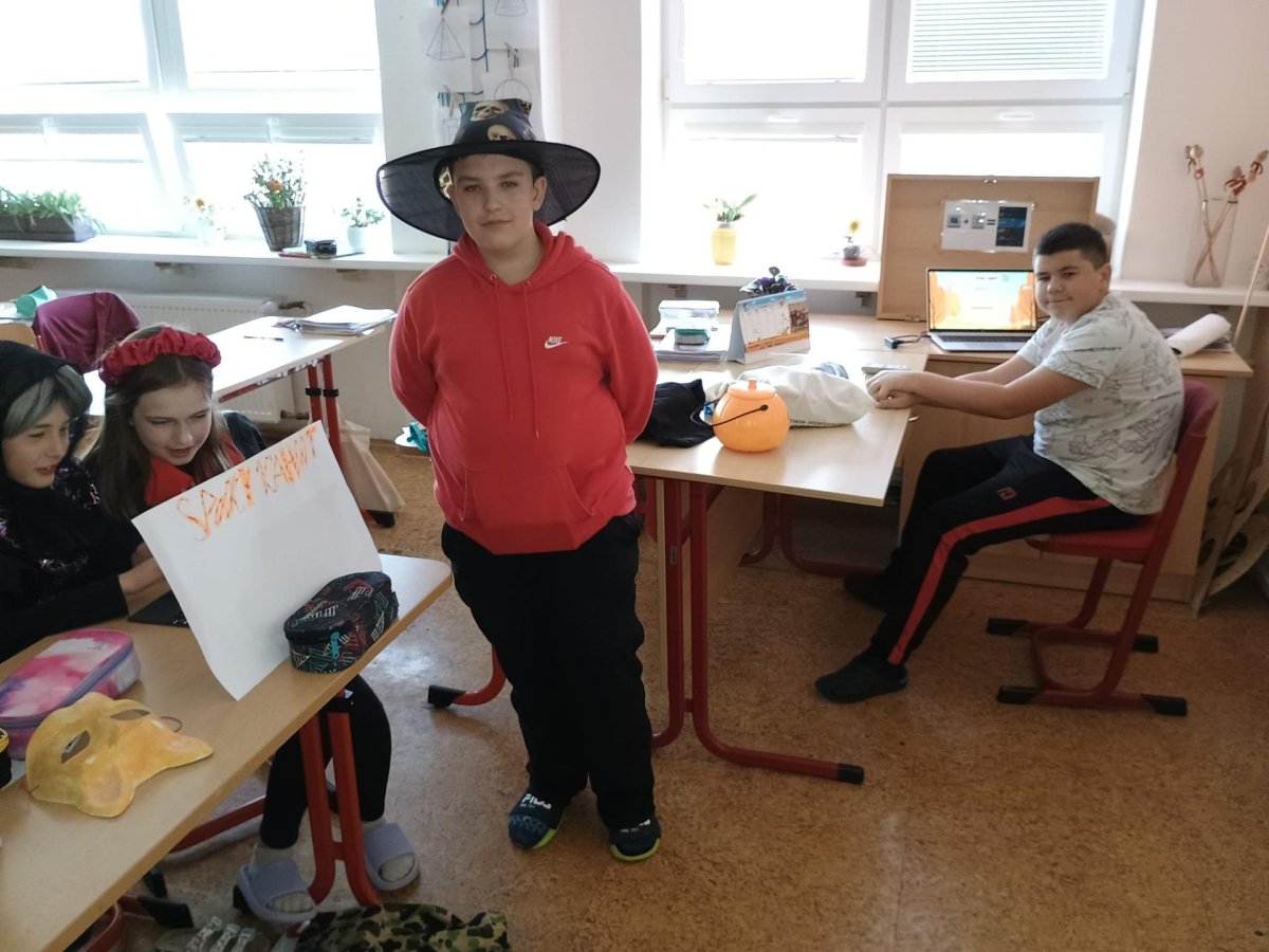 Již několik let v období svátku Halloween chystají některé třídy druhého stupně speciální hravou hodinu angličtiny pro kamarády z prvního stupně. Letos se zapojil rekordní počet tříd. Mohli si tak pohrát prvňáčci, čtvrťáci i páťáci. Zábavná pestrá stanoviště jim připravili sedmáci a deváťáci. Někteří si dokonce zavzpomínali, že před lety byli také hosty svých starších spolužáků. Happy Halloween to everyone!