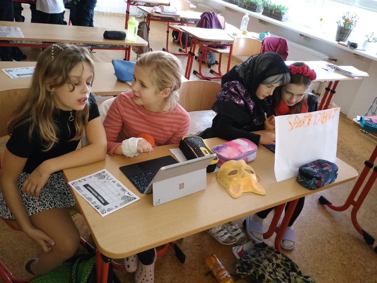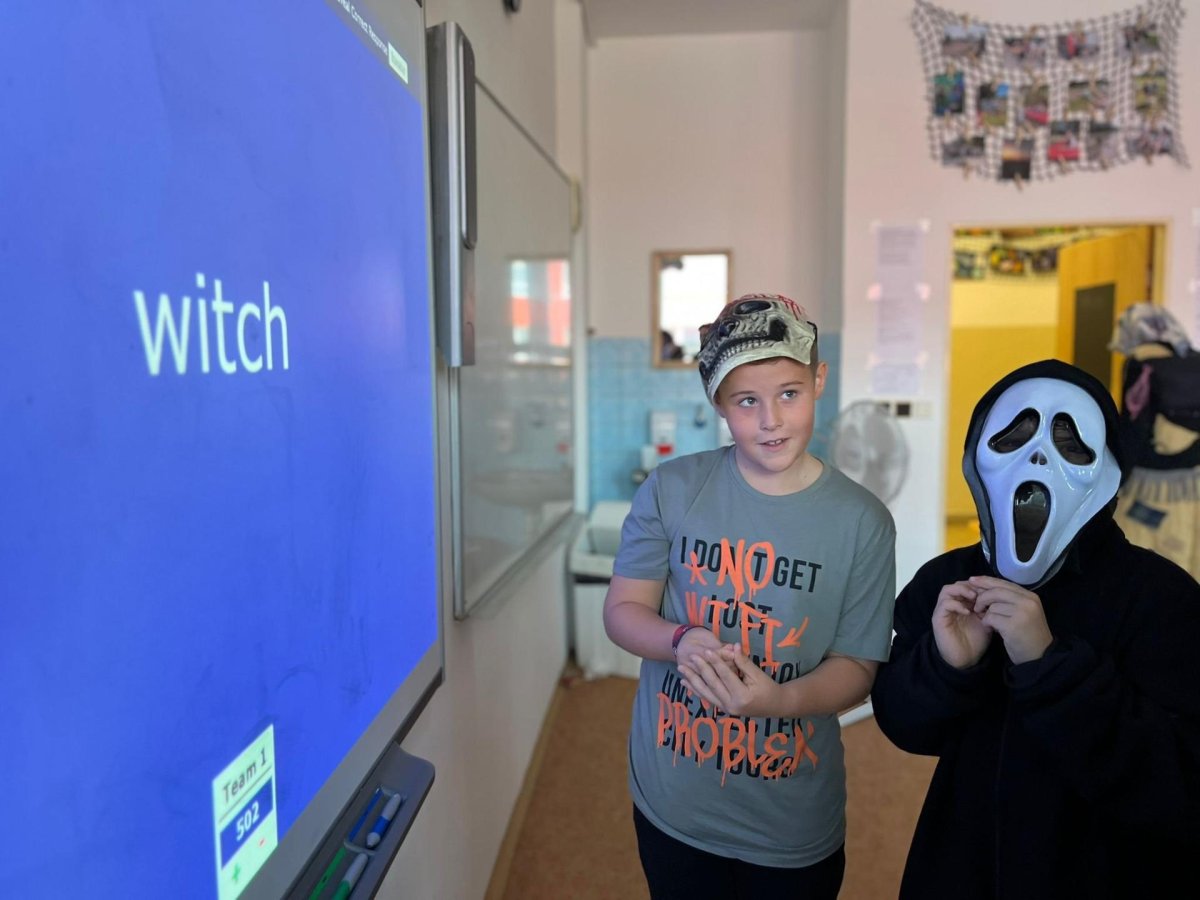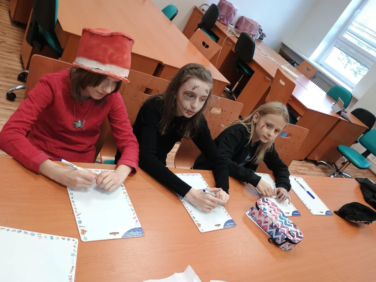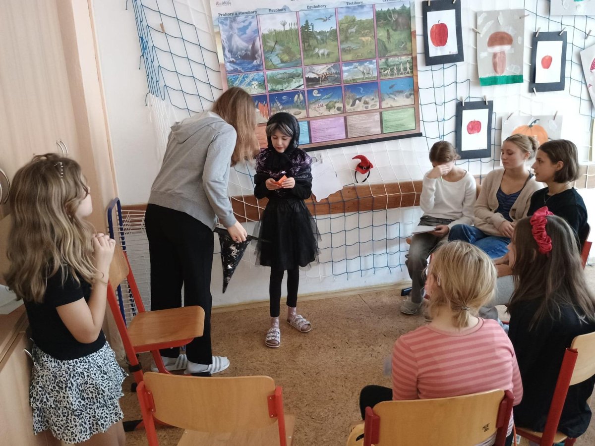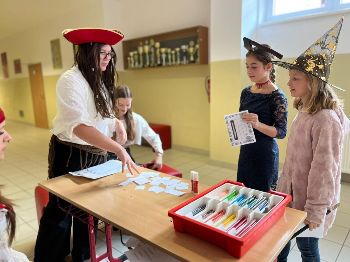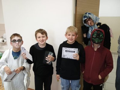 Již několik let v období svátku Halloween chystají některé třídy druhého stupně speciální hravou hodinu angličtiny pro kamarády z prvního stupně. Letos se zapojil rekordní počet tříd. Mohli si tak pohrát prvňáčci, čtvrťáci i páťáci. Zábavná pestrá stanoviště jim připravili sedmáci a deváťáci. Někteří si dokonce zavzpomínali, že před lety byli také hosty svých starších spolužáků. Happy Halloween to everyone!