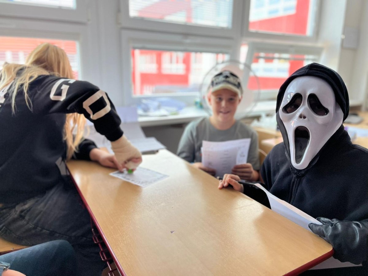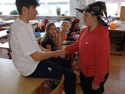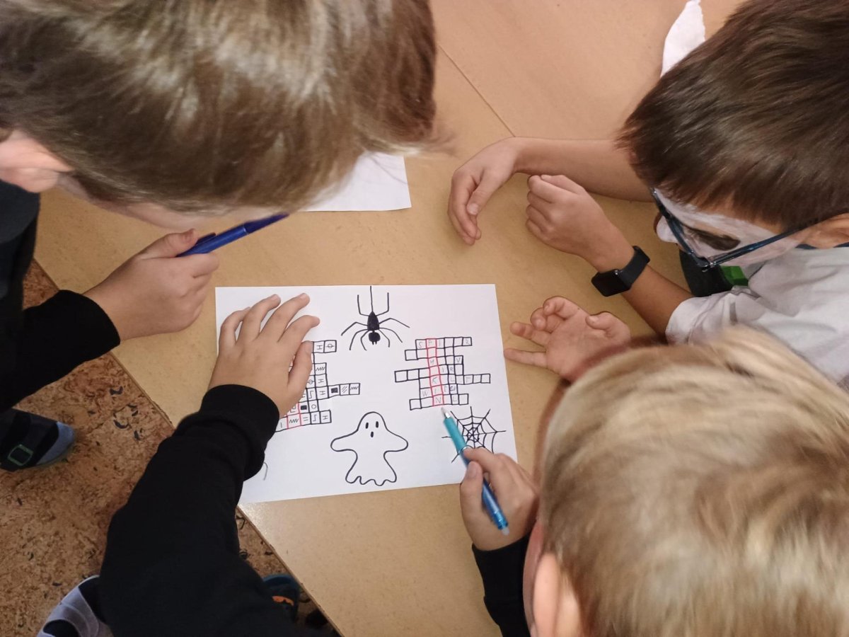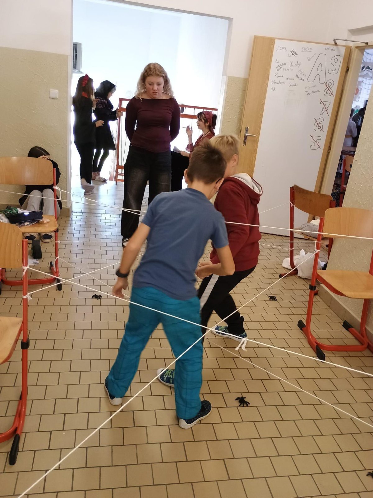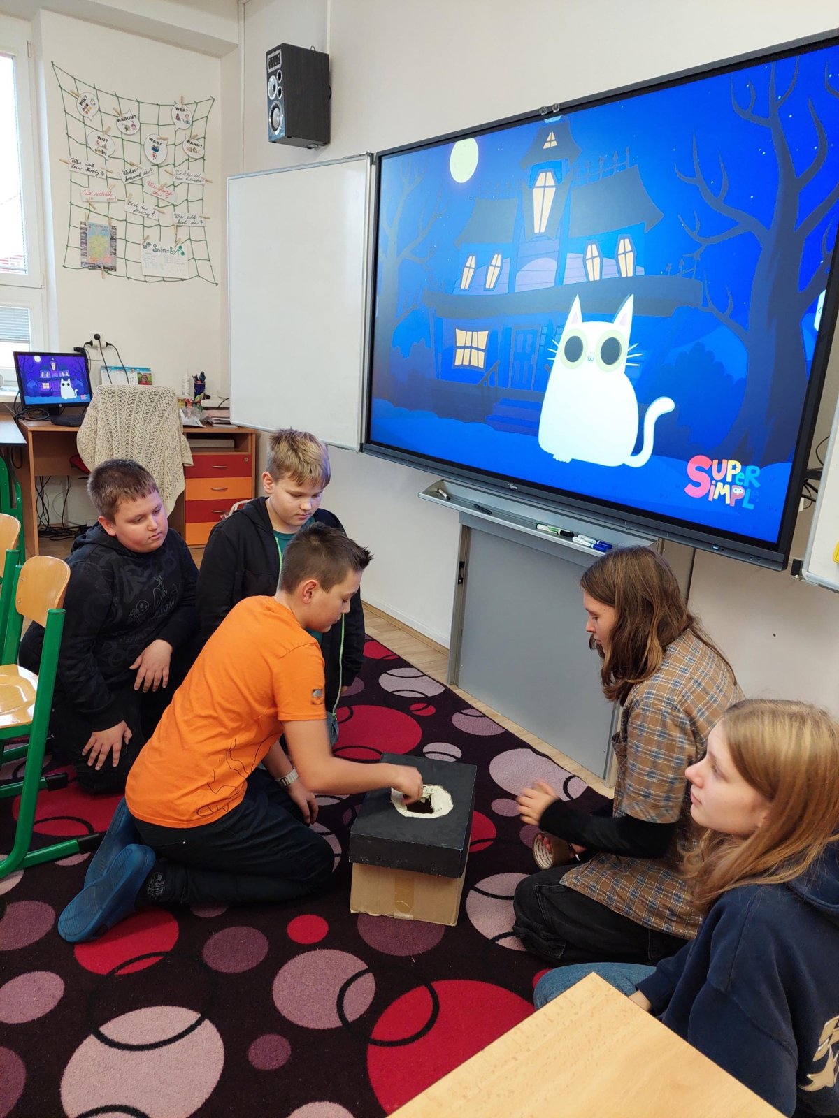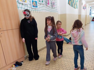 Již několik let v období svátku Halloween chystají některé třídy druhého stupně speciální hravou hodinu angličtiny pro kamarády z prvního stupně. Letos se zapojil rekordní počet tříd. Mohli si tak pohrát prvňáčci, čtvrťáci i páťáci. Zábavná pestrá stanoviště jim připravili sedmáci a deváťáci. Někteří si dokonce zavzpomínali, že před lety byli také hosty svých starších spolužáků. Happy Halloween to everyone!