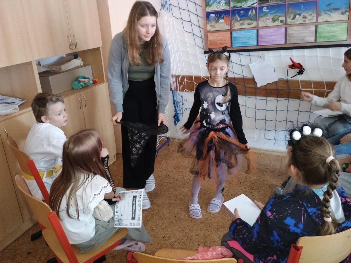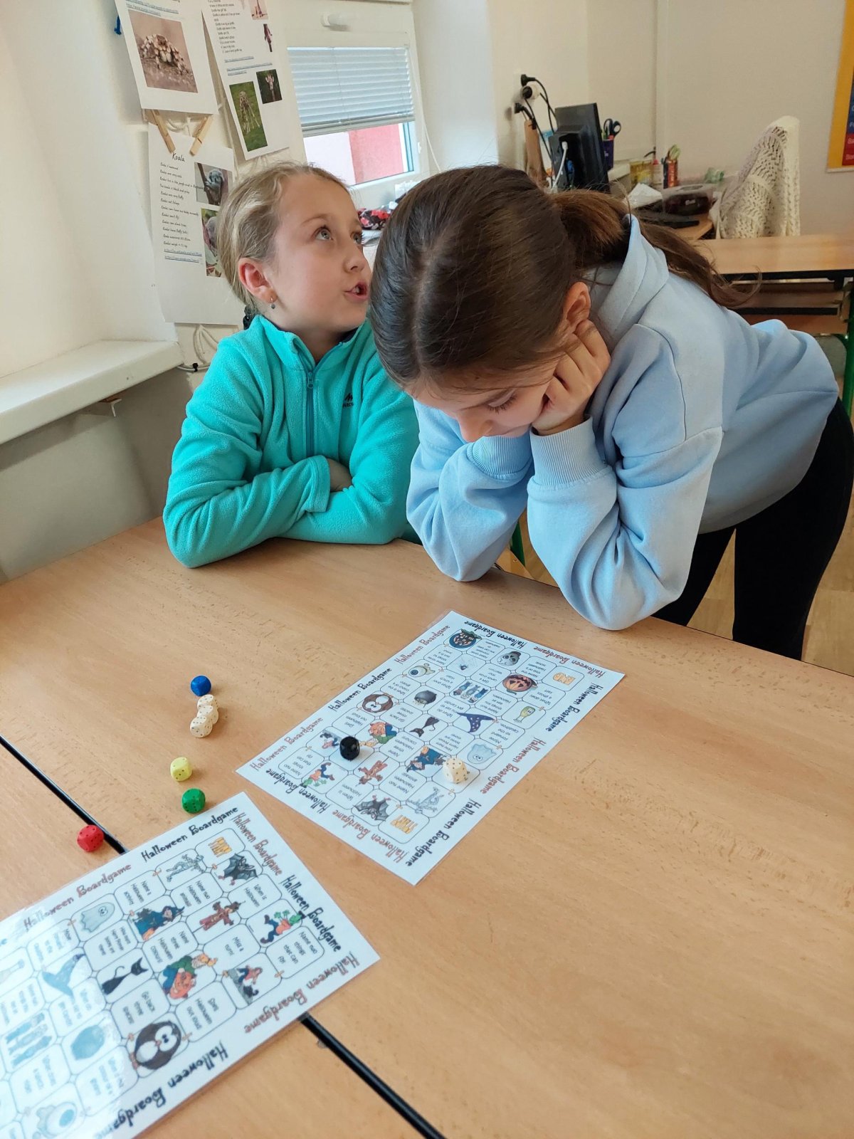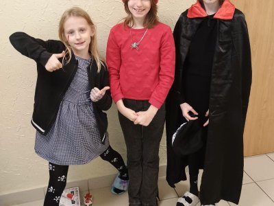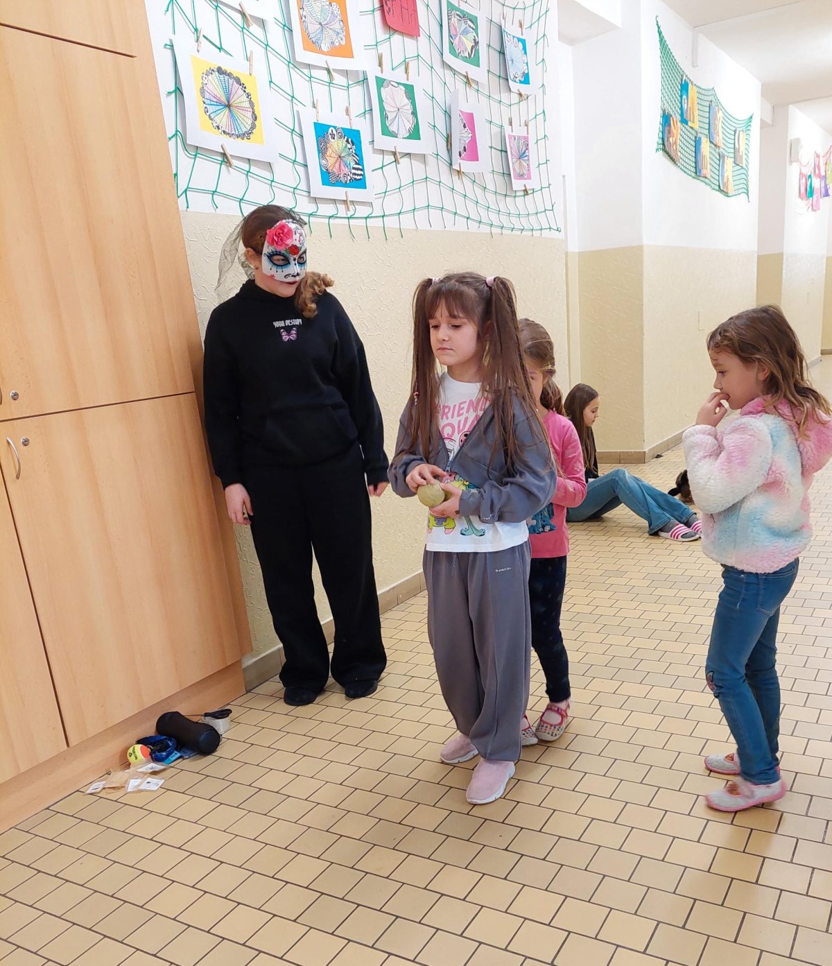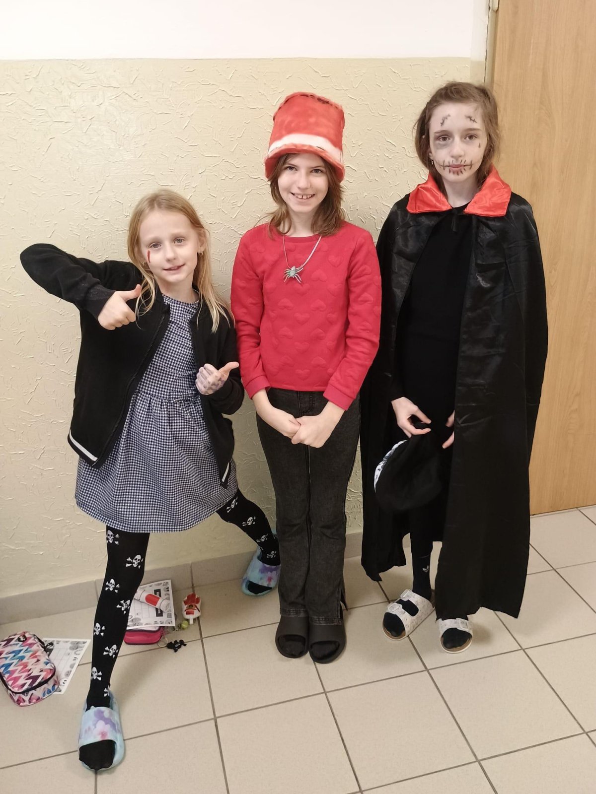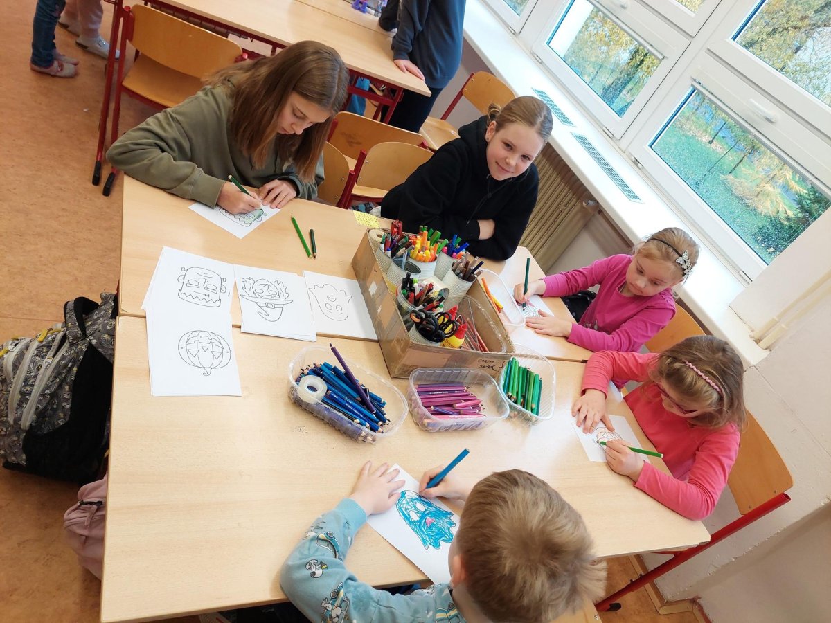Již několik let v období svátku Halloween chystají některé třídy druhého stupně speciální hravou hodinu angličtiny pro kamarády z prvního stupně. Letos se zapojil rekordní počet tříd. Mohli si tak pohrát prvňáčci, čtvrťáci i páťáci. Zábavná pestrá stanoviště jim připravili sedmáci a deváťáci. Někteří si dokonce zavzpomínali, že před lety byli také hosty svých starších spolužáků. Happy Halloween to everyone!