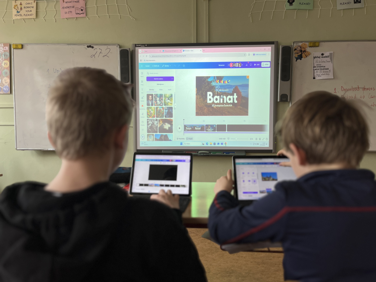 Během každého projektu objevujeme a učíme se používat různé aplikace. Na fotografii studenti pracují na krátkém dokumentu o Banátu v aplikaci Canva.