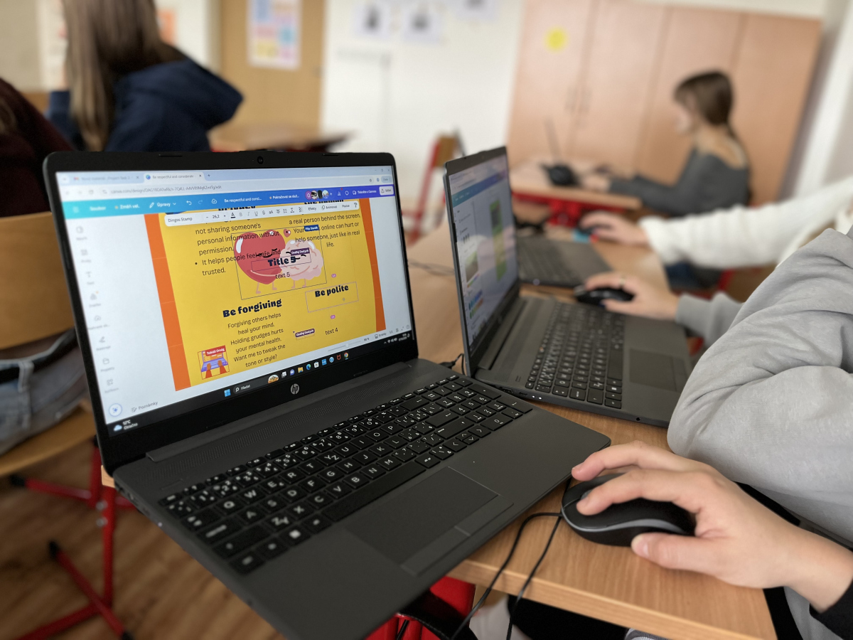 Každý projekt začíná aktivitami zaměřenými na netiketu, které zajišťují, že všichni studenti vědí, jak používat internet bezpečně a zodpovědně. Na fotce studenti 9.B spolupracují na plakátu s pravidly netikety.