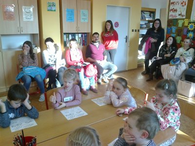 Také si všichni zazpívali a zahráli na různé bicí nástroje a boomwhackery, psali na tabuli i do sešitu a četli podle obrázků.