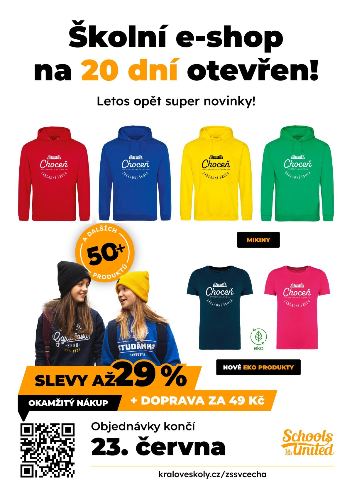Po půl roce se opět otevřel e-shop s volnočasovým oblečením s logem školy, které si před několika lety vybrali sami žáci. Děti rostou, do školy přijdou noví žáci nebo si někdo možná nestihl v minulých školních letech objednat „školní“ tričko, mikinu, kraťasy, tepláky, kšiltovku nebo batoh. E-shop přichází tentokrát se slevami a výprodejem některých modelů.