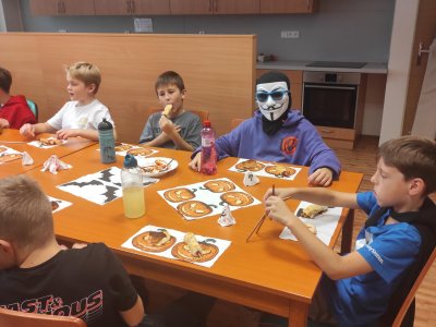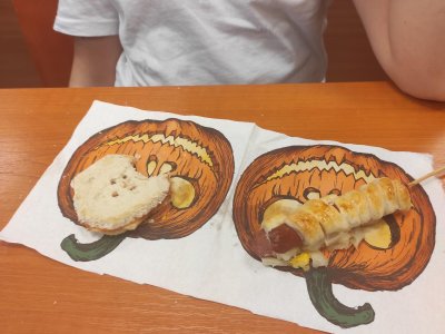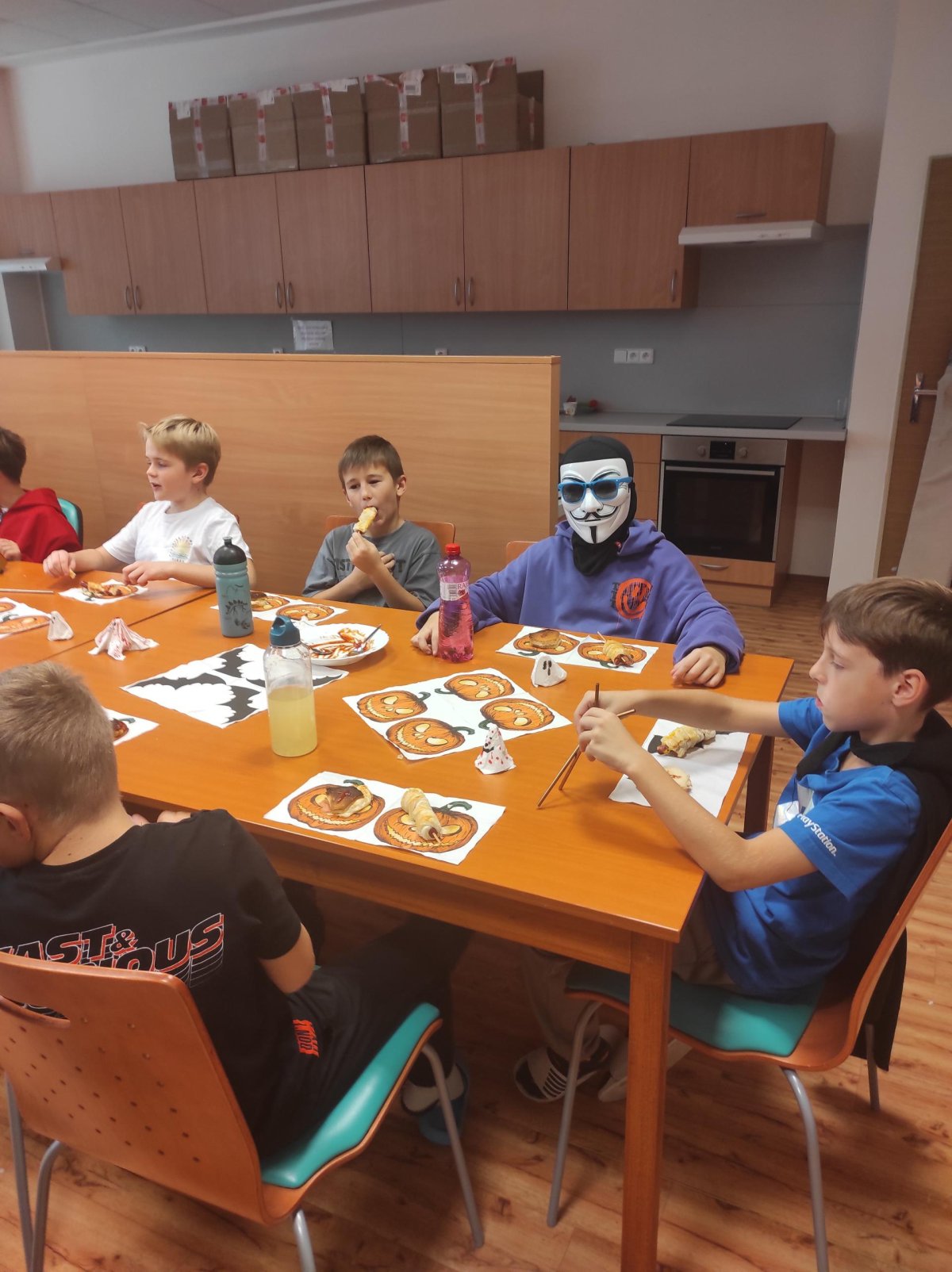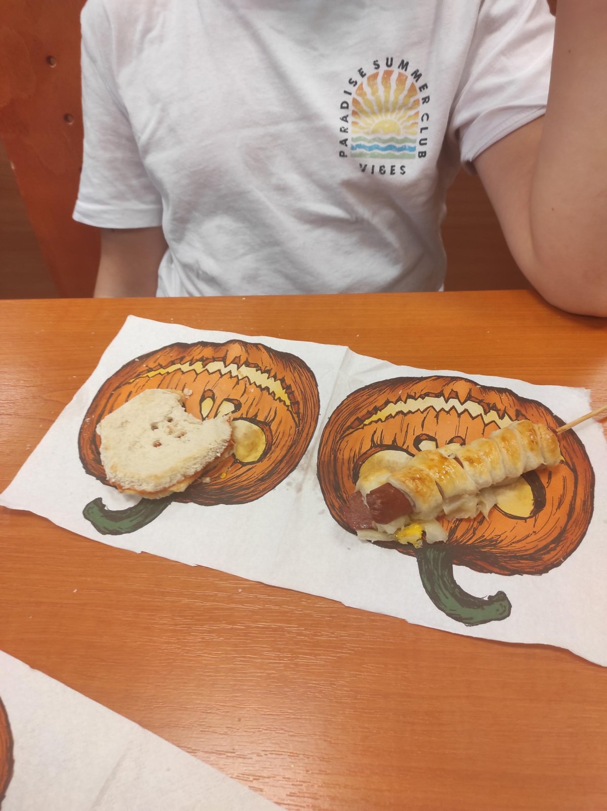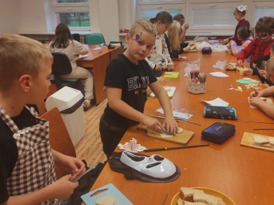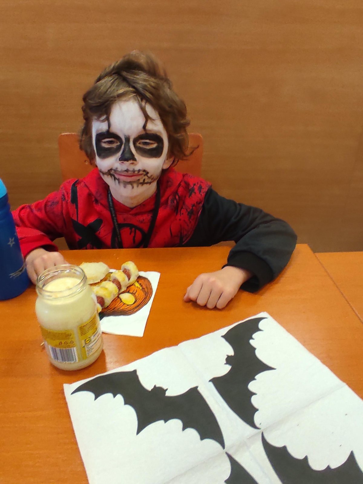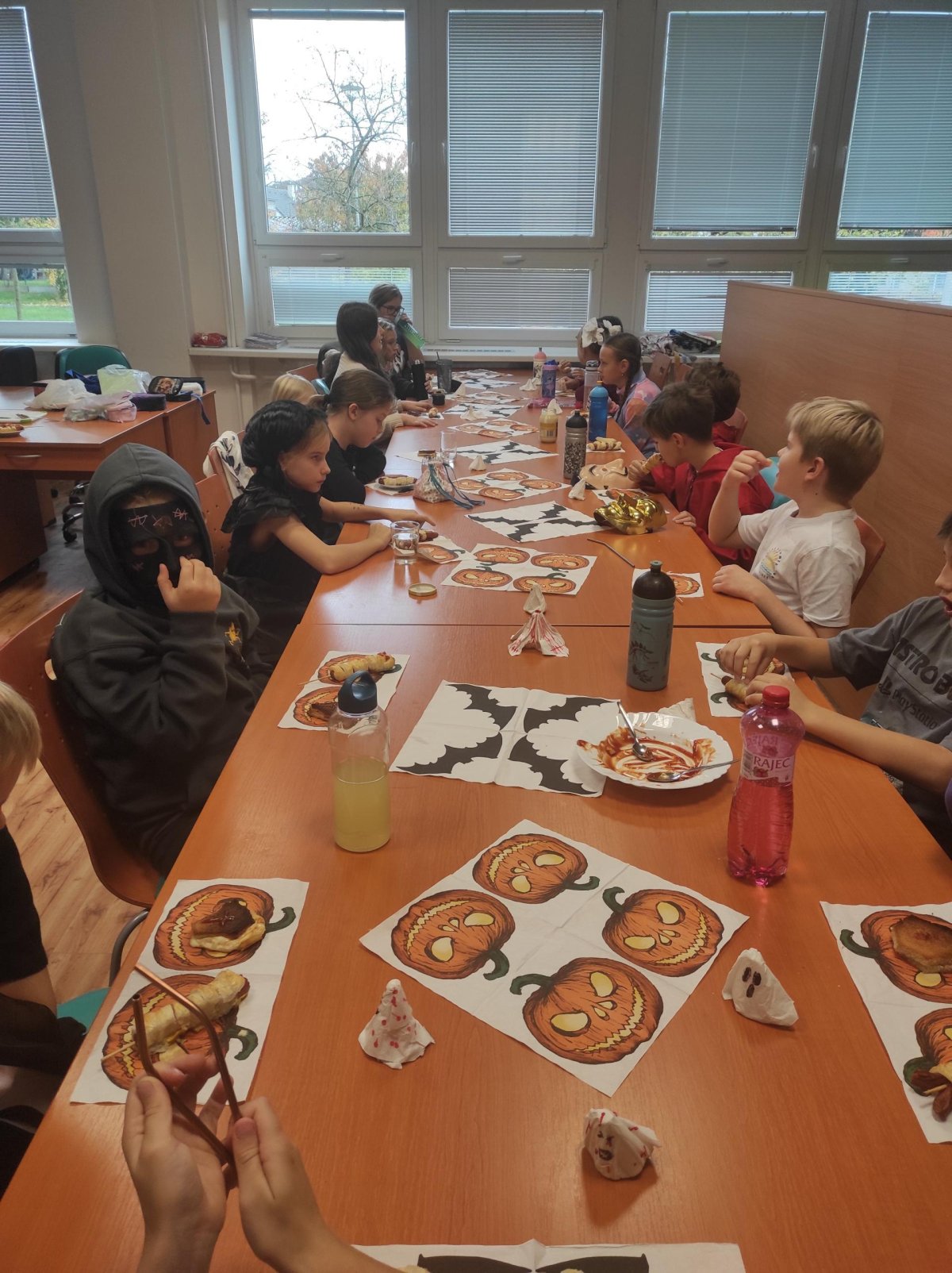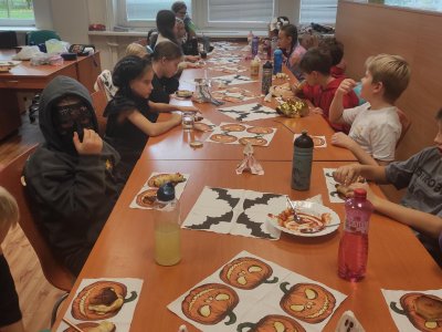 Po podzimních prázdninách se ve třídě 4.A sešli samé strašidelné až děsivé bytosti. Po malém plánovaném testíku z přírodovědy se "vyčerpané" bytosti přesunuli do školní kuchyně s vidinou slibované hostiny. Na jídelním lístku byla mumie pečená v troubě, tousty ve tvaru rakviček s krvavým křížkem (kečup) a kořeněné chipsy z brambor ve tvaru dýničky s obličejem.