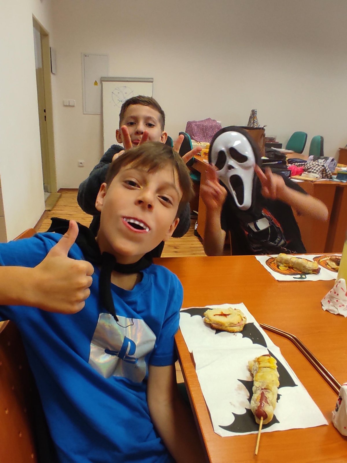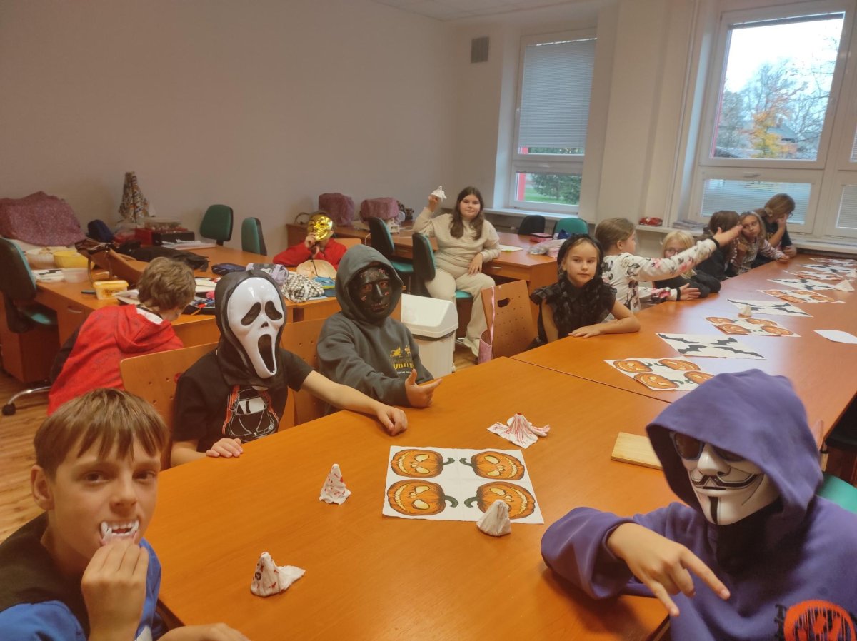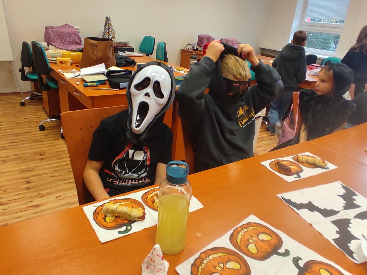 V průběhu hostiny čekalo děti ještě jedno překvapení. Z 9.A třídy přišel Tomáš číst svůj strašidelný příběh a Hana úchvatně přednést básně ze své tvorby. Žáci poslouchali s otevřenou pusou (pokud jim to maska dovolila).....