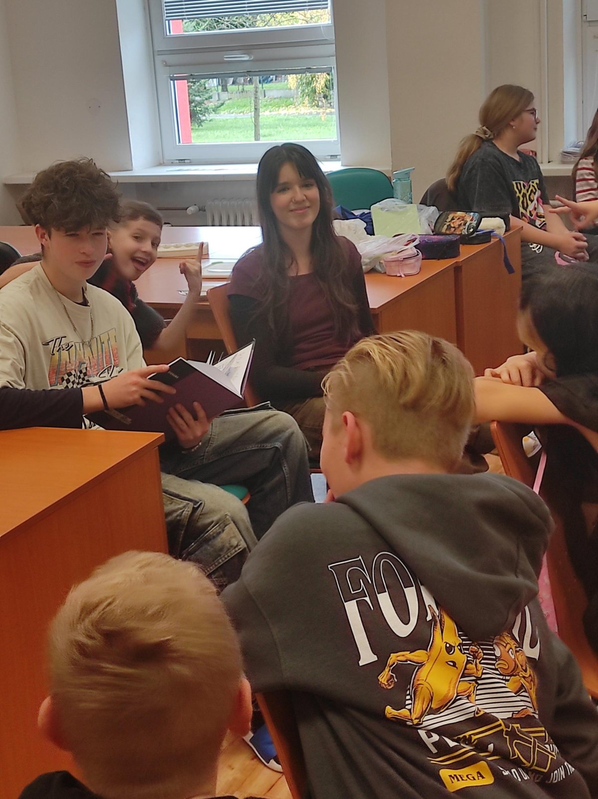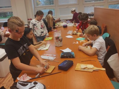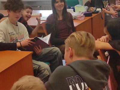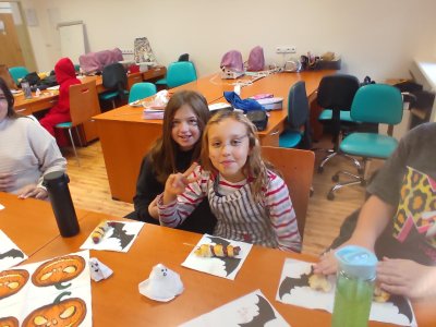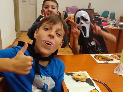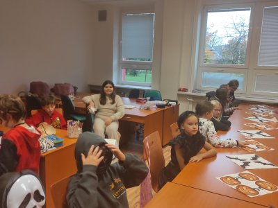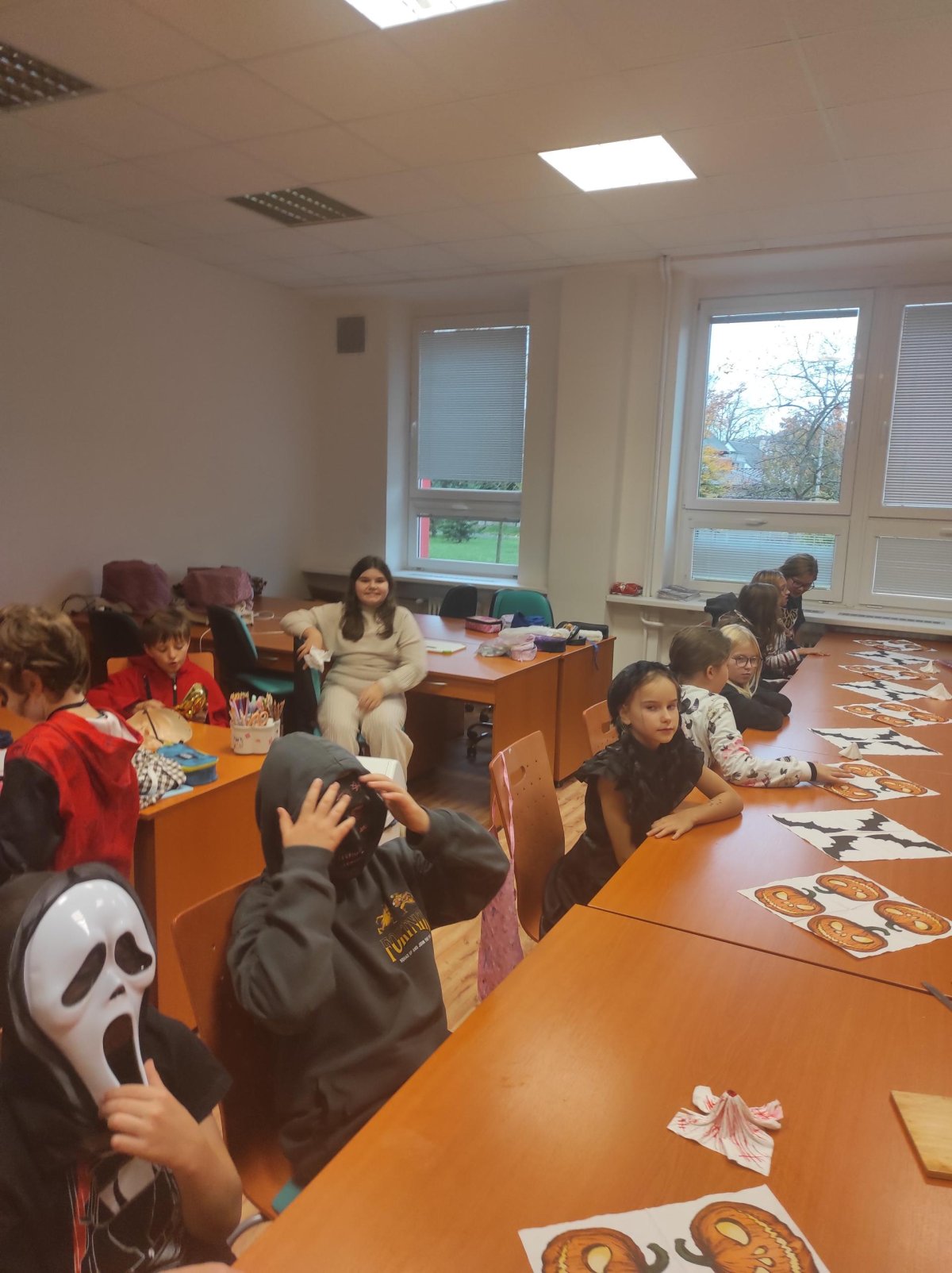 V průběhu hostiny čekalo děti ještě jedno překvapení. Z 9.A třídy přišel Tomáš číst svůj strašidelný příběh a Hana úchvatně přednést básně ze své tvorby. Žáci poslouchali s otevřenou pusou (pokud jim to maska dovolila).....