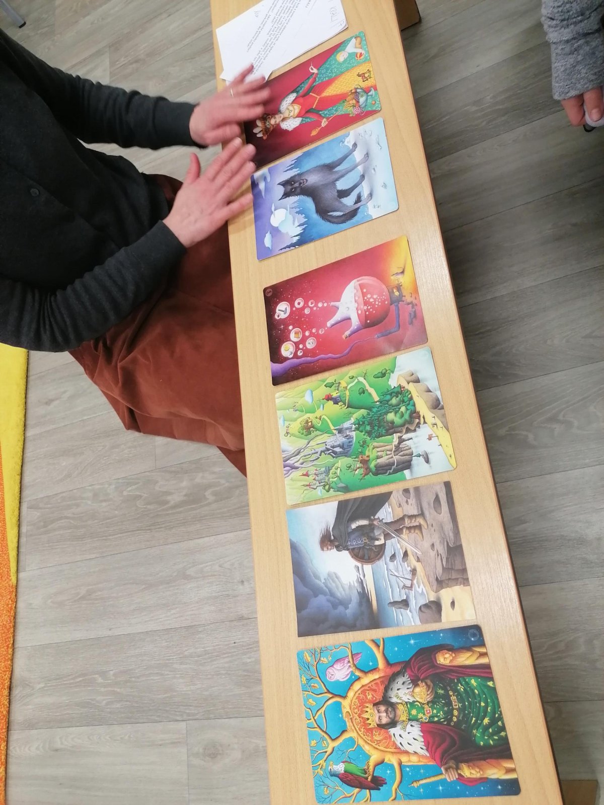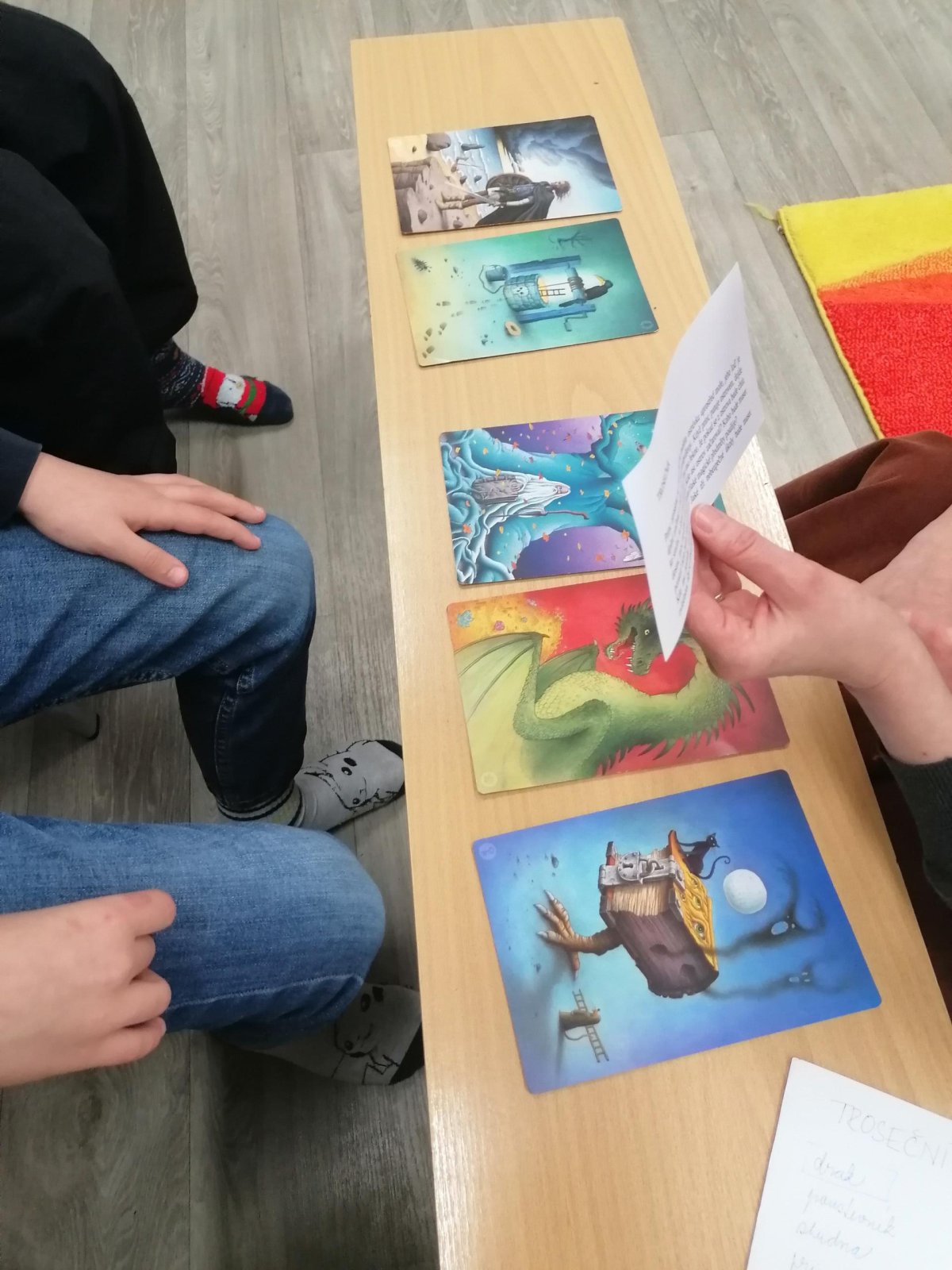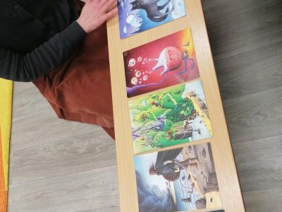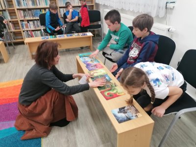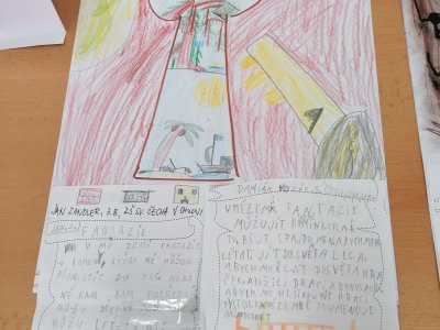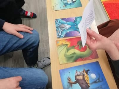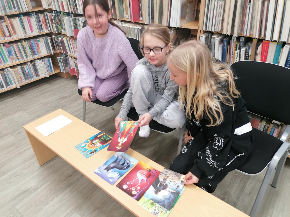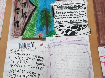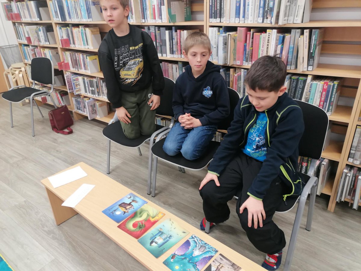 Nejprve se děti v knihovně s paní Plhákovou ponořily do tajů příběhu a zkusily si pomocí malovaných karet vytvořit vlastní fantazijní příběh. Došlo i na vlastní krátké literarni ztvárnění.
