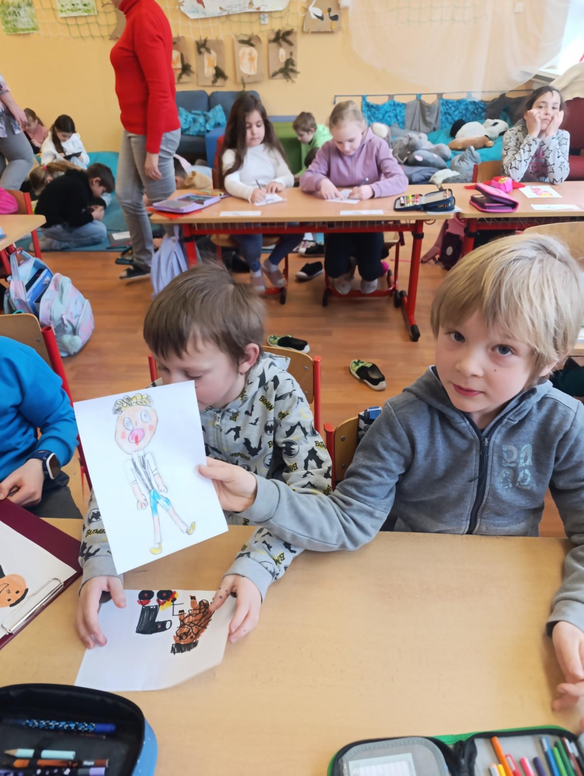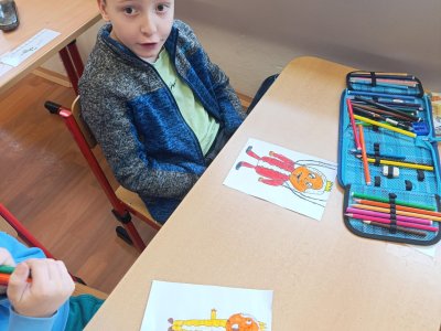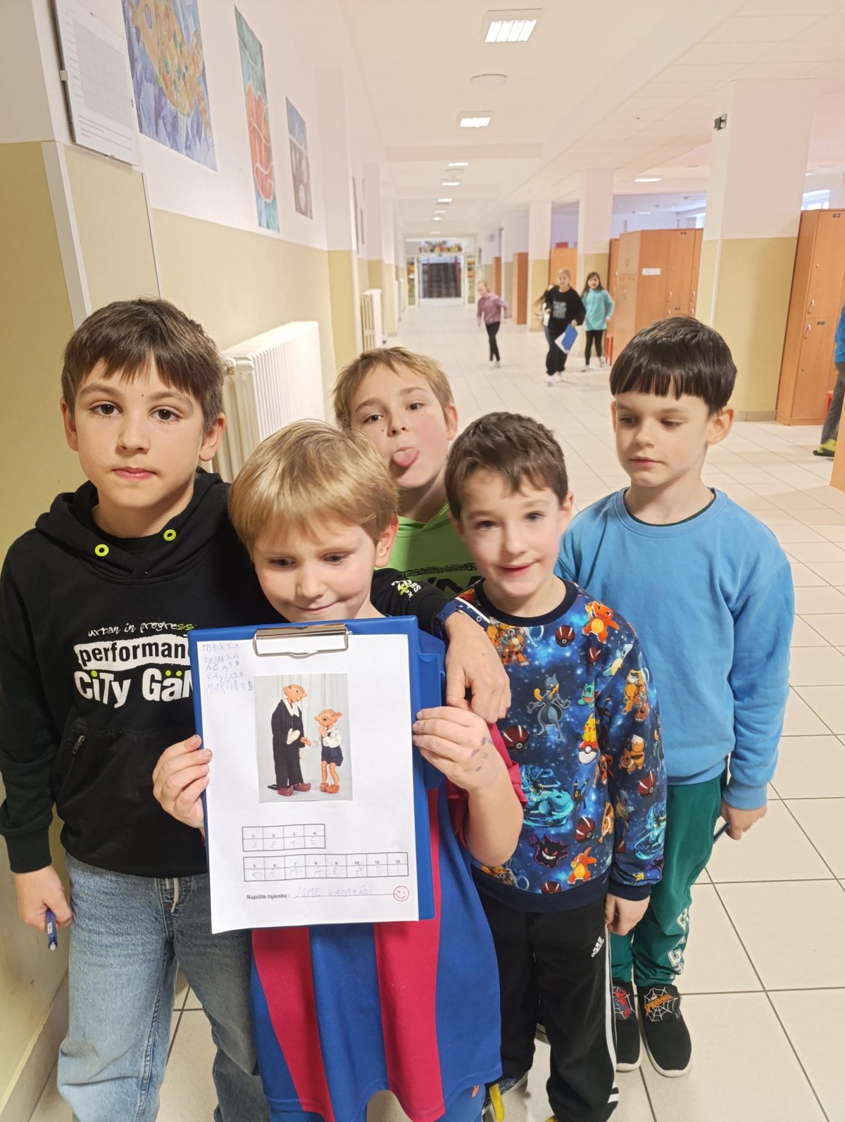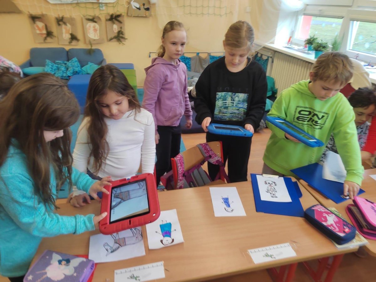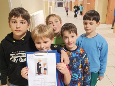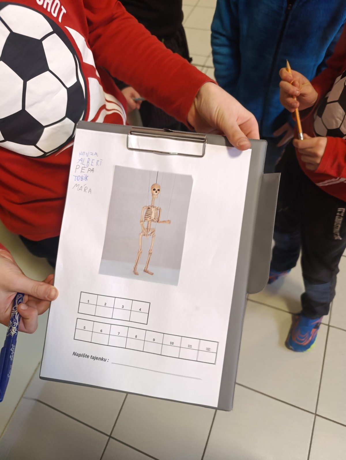 A tak se taky ve čtvrtek stalo. Třeťáci k nám dorazili hned na dvě vyučovací hodiny a mohlo se začít. Nejprve jsme si všichni nakreslili loutku, kterou jsme si na našem výletě vyrobili. Tu jsme pak vtipně rozpohybovali v různých pozicích na webové stránce. Pak už nás čekal pracovní list se záludnými otázkami v šatně školy. Děti pracovaly ve skupinkách a při této hře zúročily své znalosti z muzea. Výsledná tajenka JSME KAMARÁDI byla více než pravdivá.