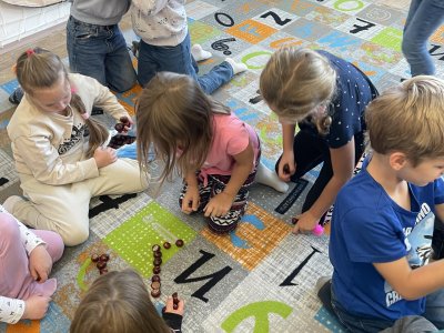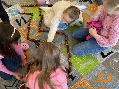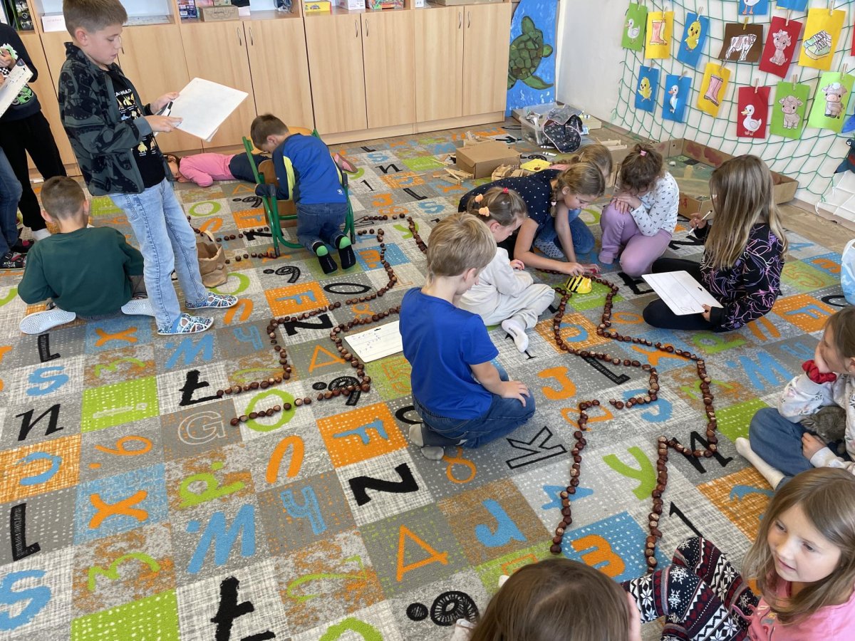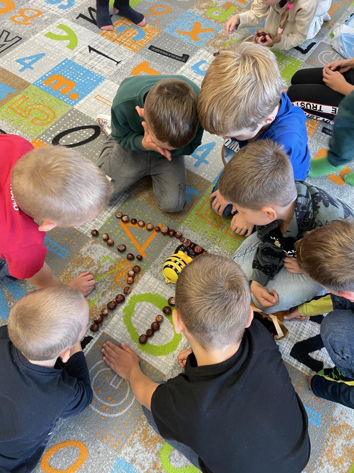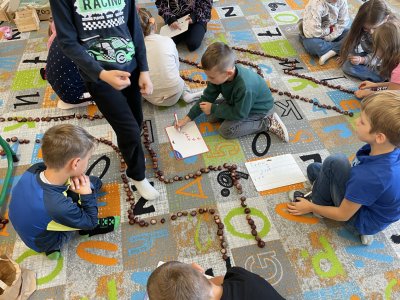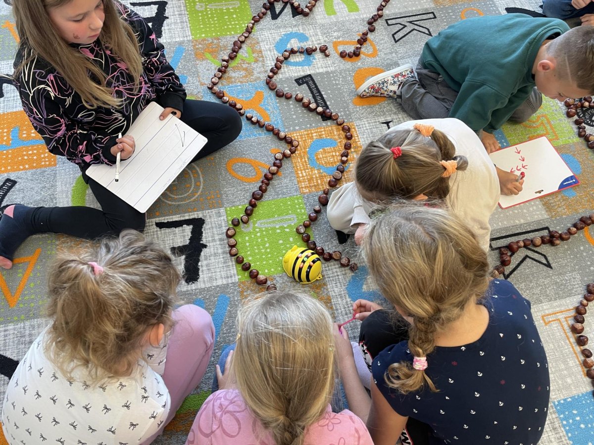 Ráda vás poznávám! Jsem BeeBot, malá programovací včelka. Umím chodit dopředu, dozadu, otočit se vpravo, vlevo a i celá se otočit můžu! Děti pro mě zkusily postavit bludiště z kaštanů. A já jsem chodila podle toho, jak mě naprogramovaly :).