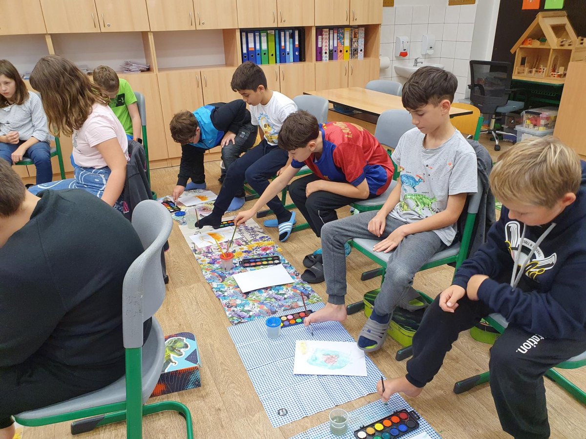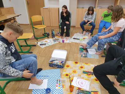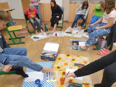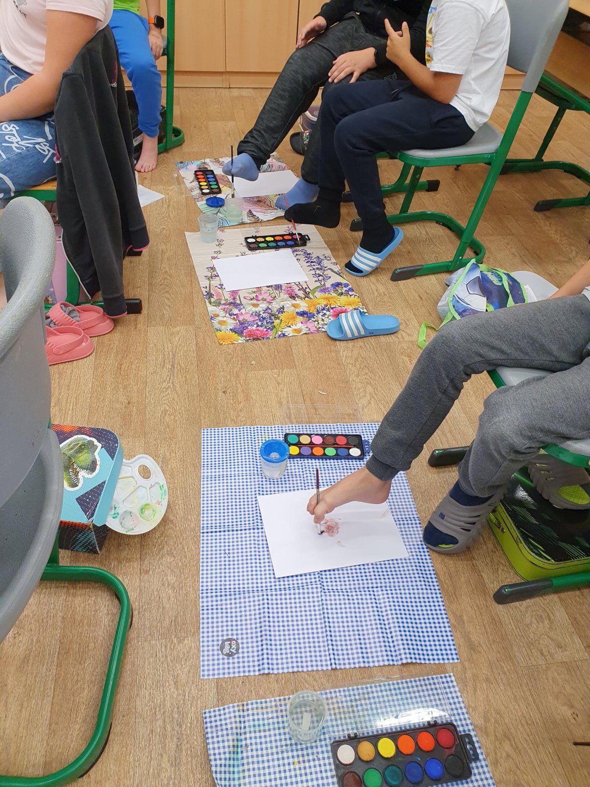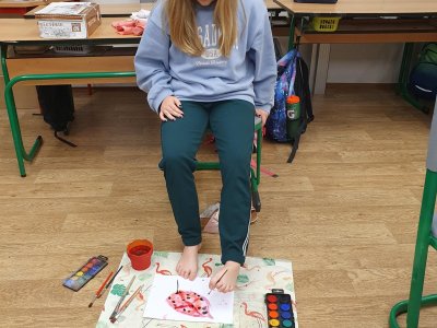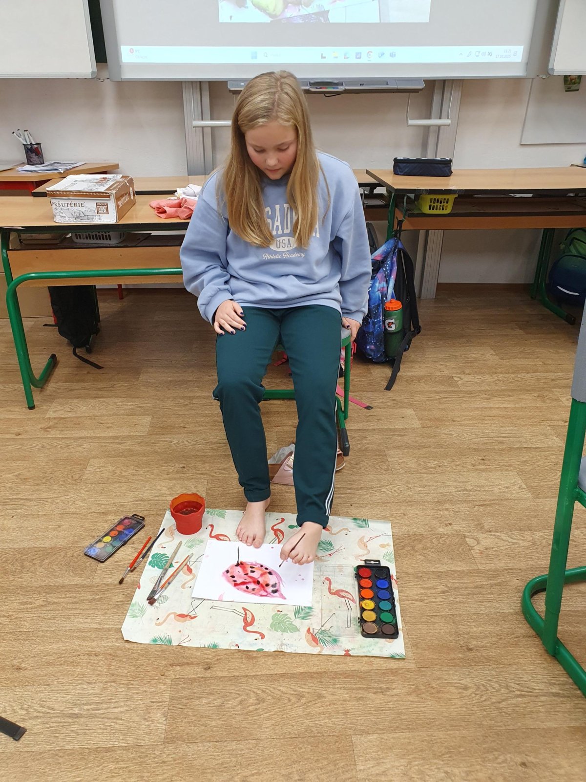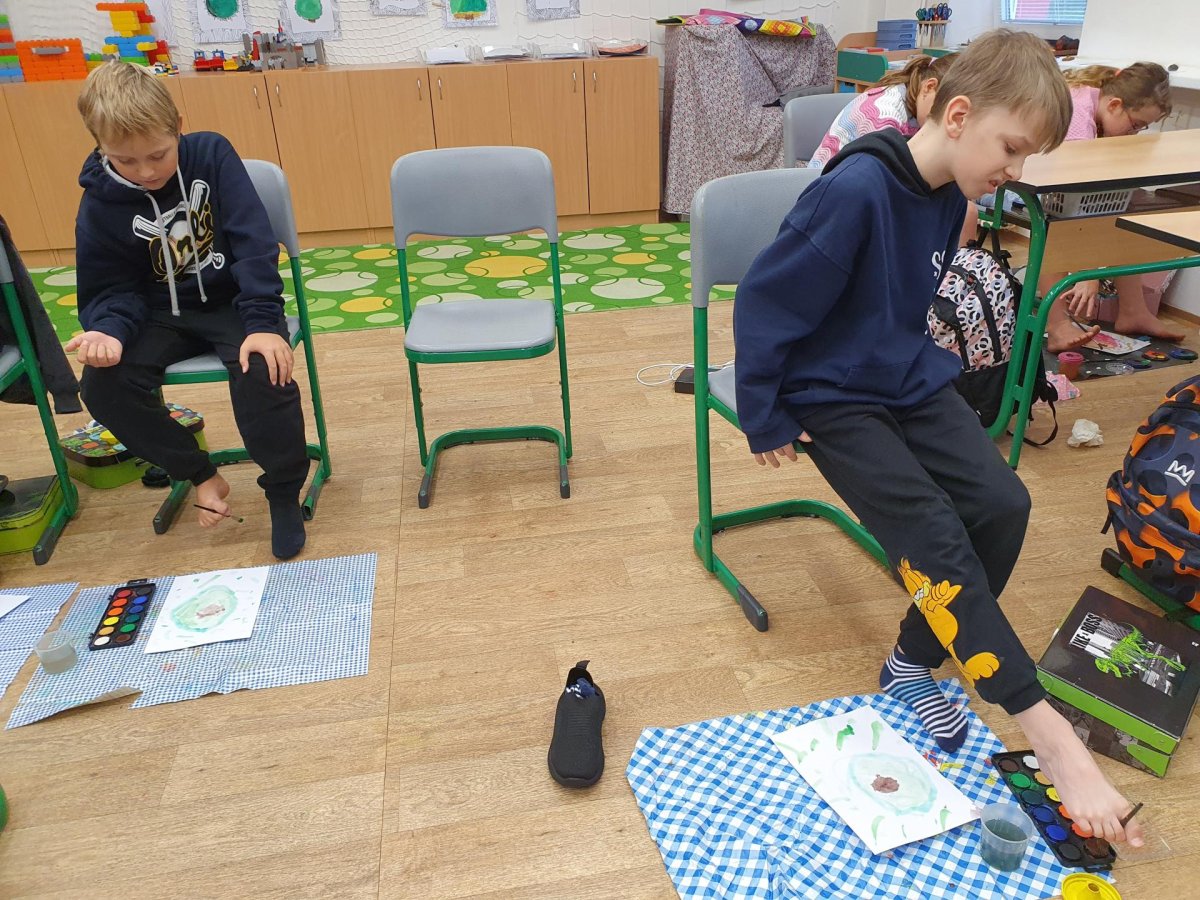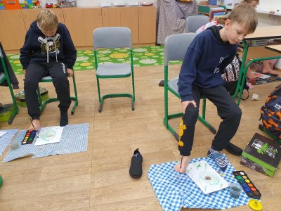 V rámci výtvarné výchovy si děti vyzkoušely malovat nohama. Mluvili jsme o lidech, kteří nemohou k tvorbě používat ruce.