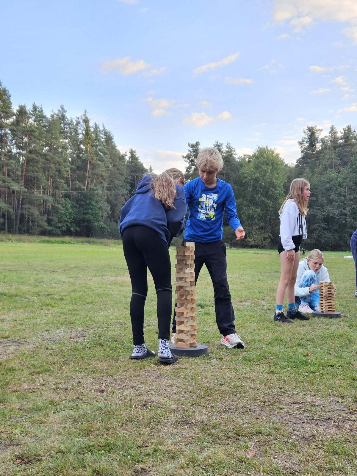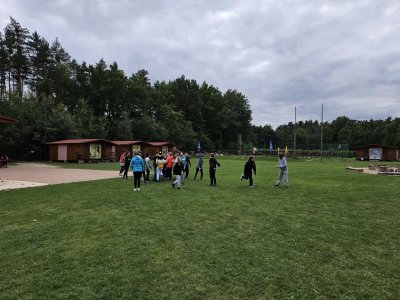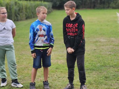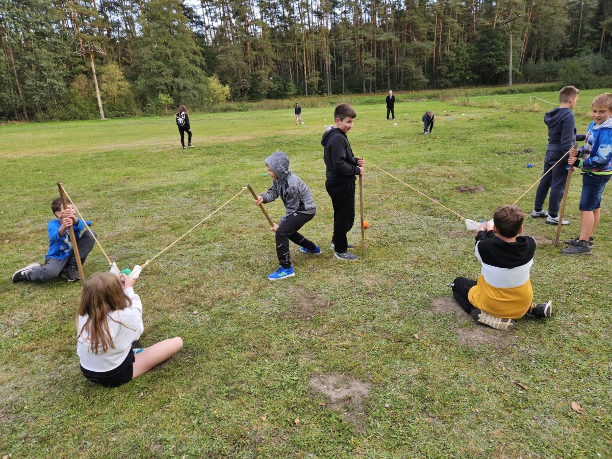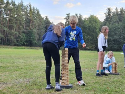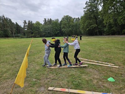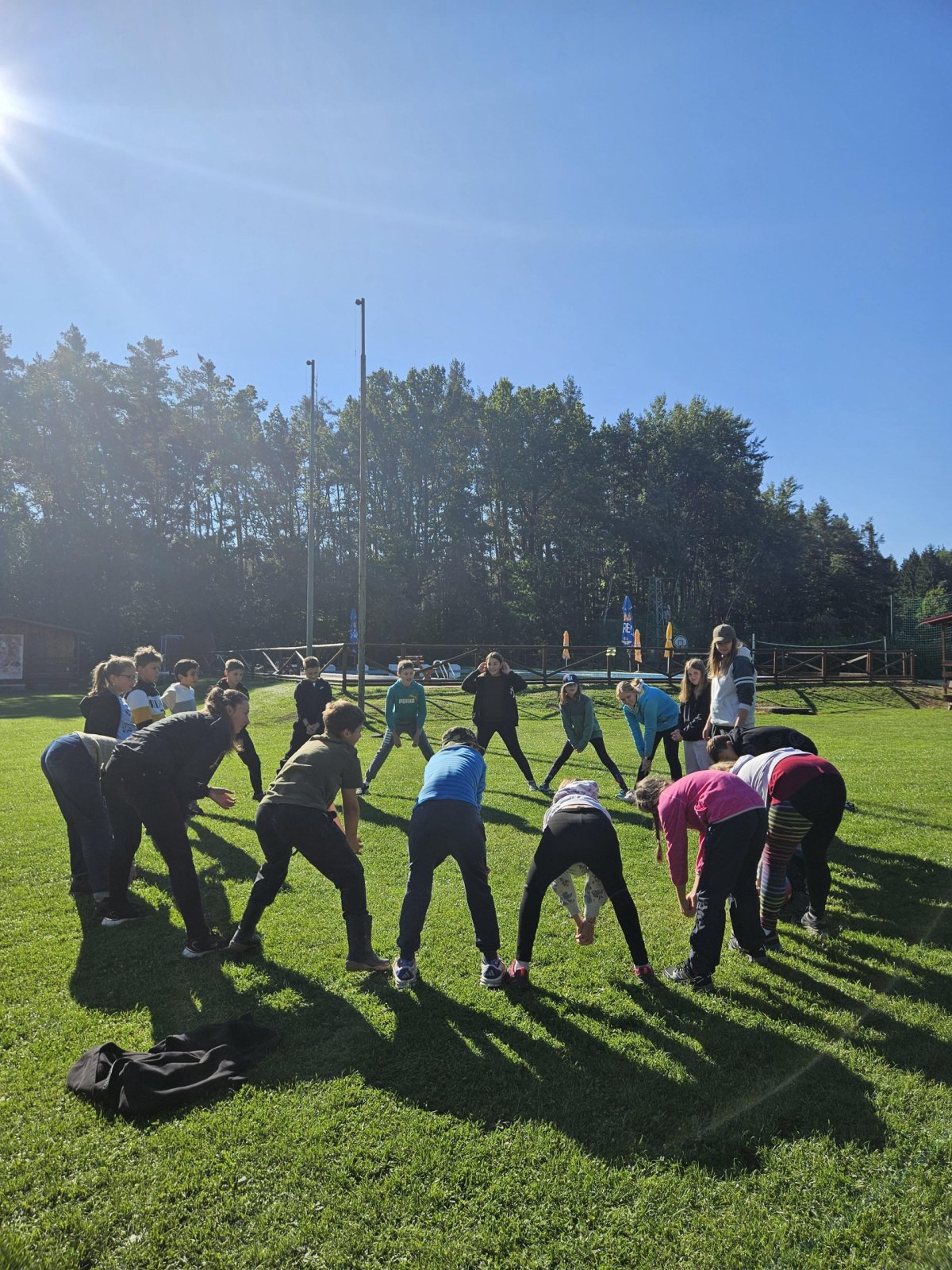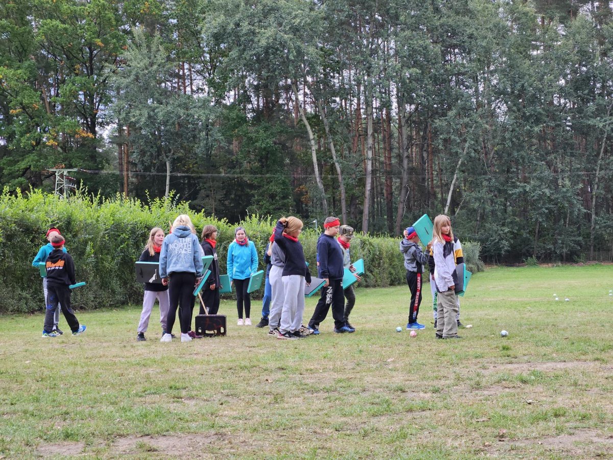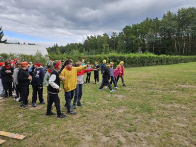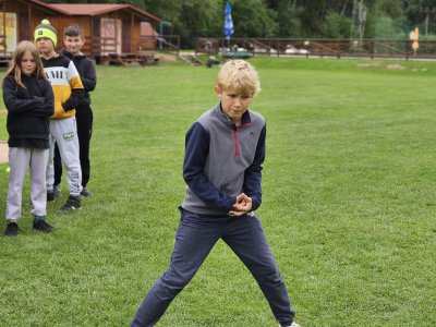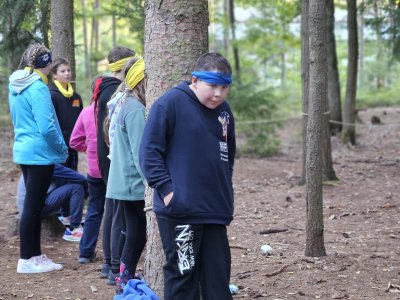 Adaptační kruz jsme zahájili v pondělí na nádraží v Chocni, kde jsme předali kufry a vyrazili vlakem směr Čermná nad Orlicí. Tam jsme vystoupili a pěšky se vydali úctyhodných 11 kilometrů do Horního Jelení a dále do rekreačního zařízení Tramtáryje. Bylo krásné počasí a všichni cestu zvládli na jedničku. I přes únavu po dlouhé cestě jsme se hned po obědě vrhli na první z programů, který cílil na stmelení kolektivu a spolupráci. Žáci si vyzkoušeli například stavění věží za pomoci provázku nebo střílení prakem.